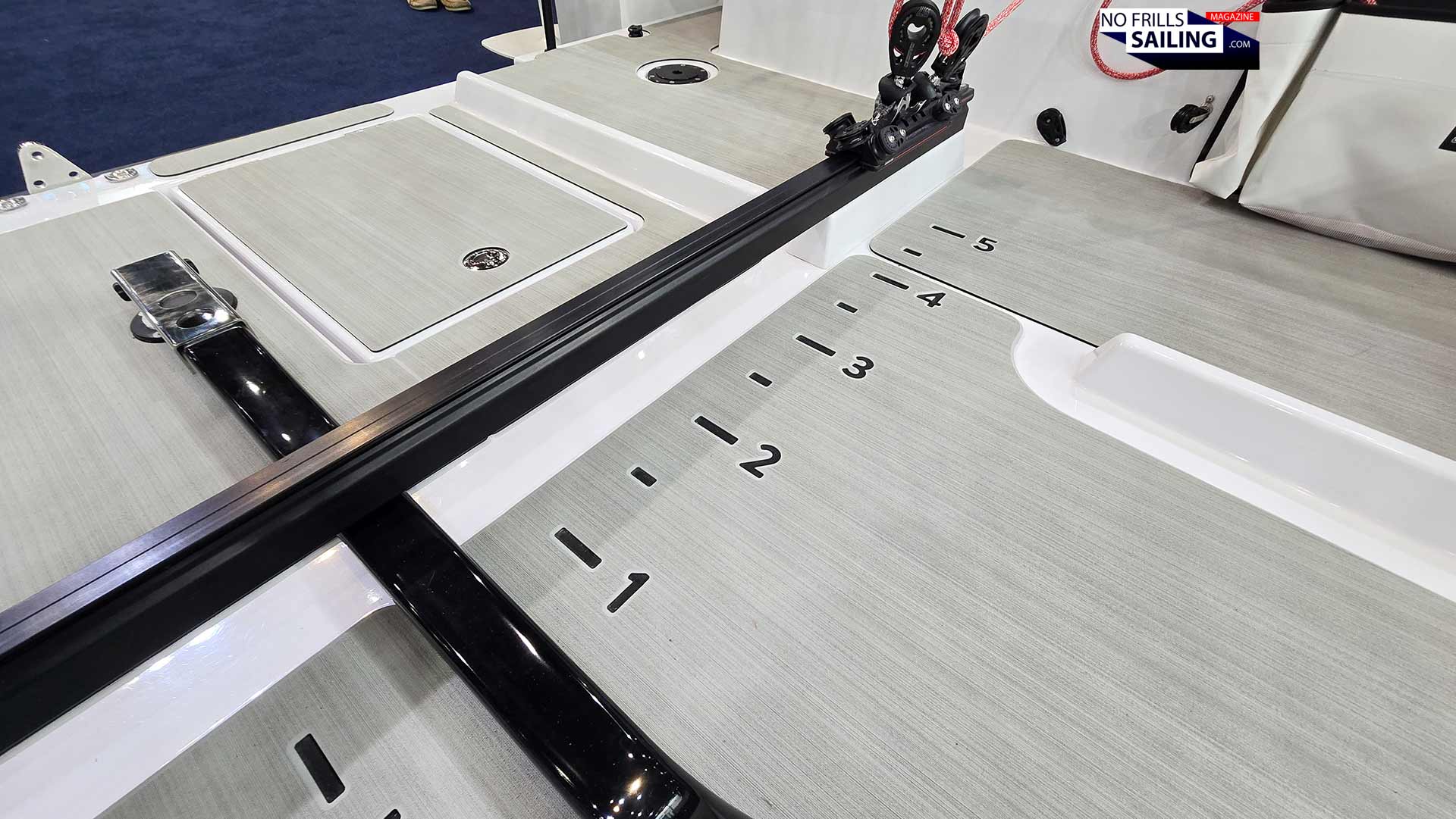 The aft area of the cockpit is dominated by the mainsheet traveler. This very important sail trim feature runs from one side to another. It has been mounted on two raised GRP bases so that the tiller runs forward underneath it: A proven setup from the First 27 SE. I don´t know if I like the numbers/markings etched into the floor, but you surely can go for a different design or style.