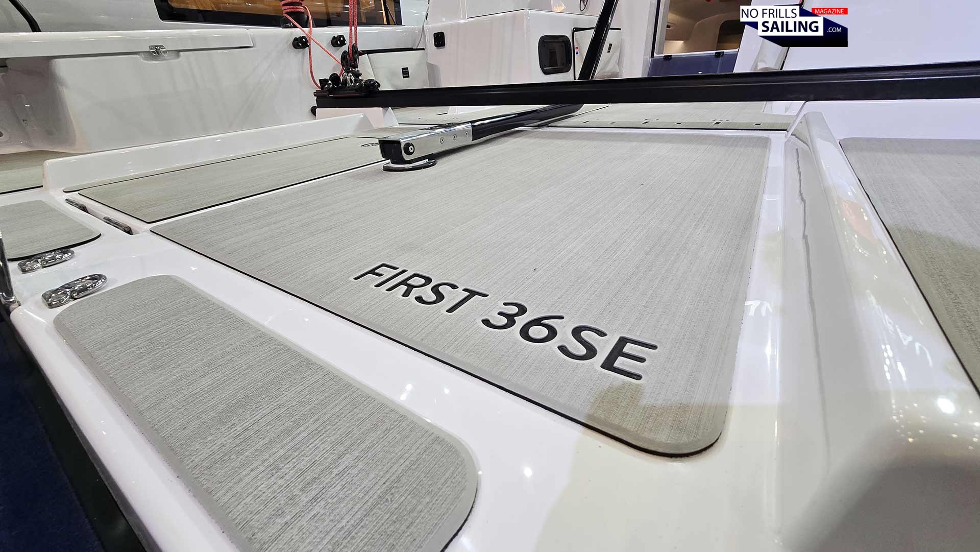 The standard First 36 comes with standard boat building plywood, veneered with First-style faux Teak. This boat´s floor boards however are made of extremely lightweight composite. Even though they are fitted with SeaDek EVA-foam, they only weigh a few couple of grams. You can easily lift them with two fingers. I don´t know how much this saves in kilograms, but the difference is striking.
