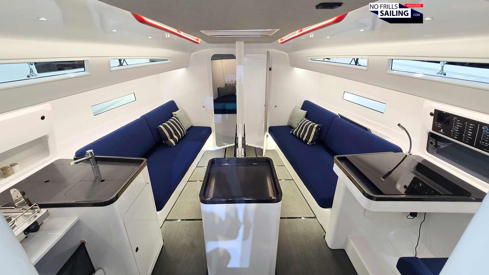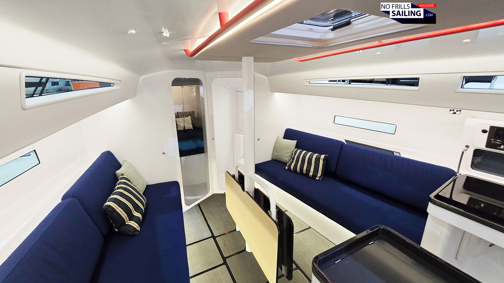 In this, I am sure you are surprised now. The interior looks far from “stripped”. A bit colder from its impression, but less comfy? No. The First 36 SE offers the same amount of onboard comforts as her standard sister. The nice, wide salon benches (with the clever fold-behind backrest-cushions) can be turned to berths in matter of a second. There´s a fold-up central table and the same layout for galley, nav station and cabins. I imagine changing the straight blue cushion color to my GEKKO´s orange again – she´d be perfect!