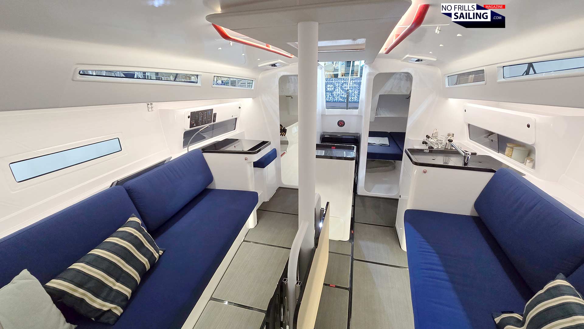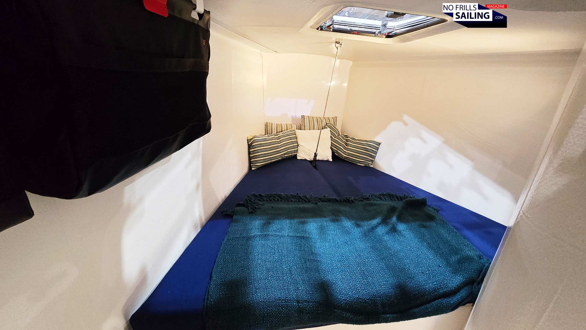 Well, maybe for the fact that the attachment point for the inner forestay up on deck is extended through the cabin and secured to a chain plate between the two mattrasses. If no inner stay is needed for the small Jib, the Dyneema-lashing can be easily removed so that you get your full-sized double front cabin back. Many racing crews however will surely mainly use the front cabin as sails locker and utilize the aft cabins. But anyway, three full cabins, if needed.