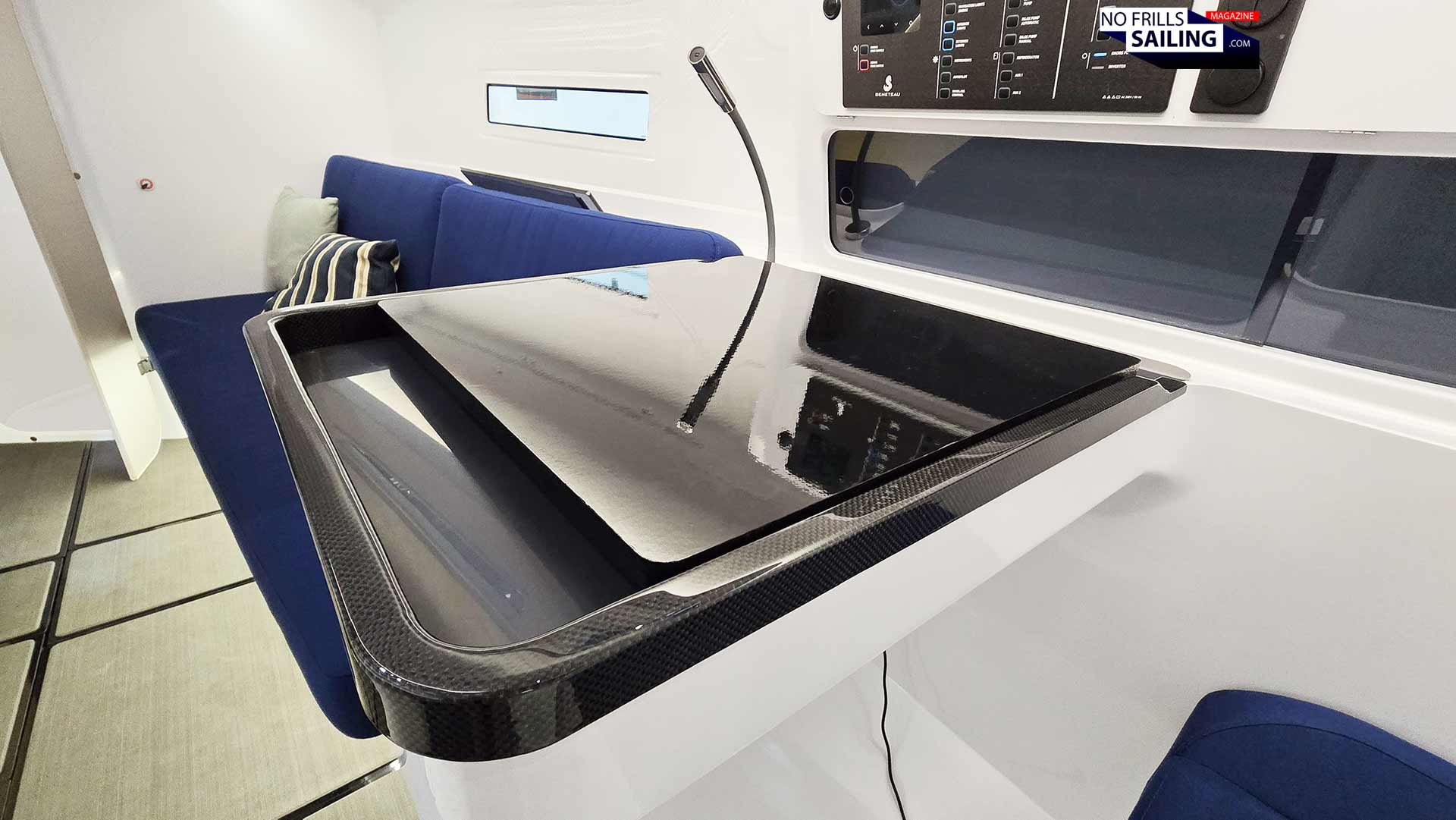 All of the massive wooden parts (in the case of the First 36 laminated) have been removed. Instead, the shipyard had fitted nicely done carbon fiber fiddles and embrasures, as you can see, around the fridge and chart table. All in all, it feels very significant, reasonable and looks just beautiful.