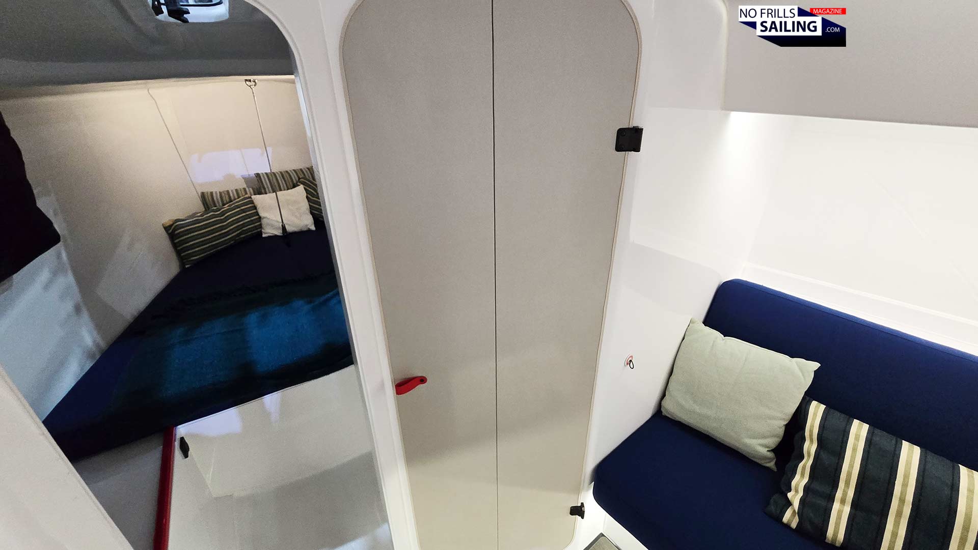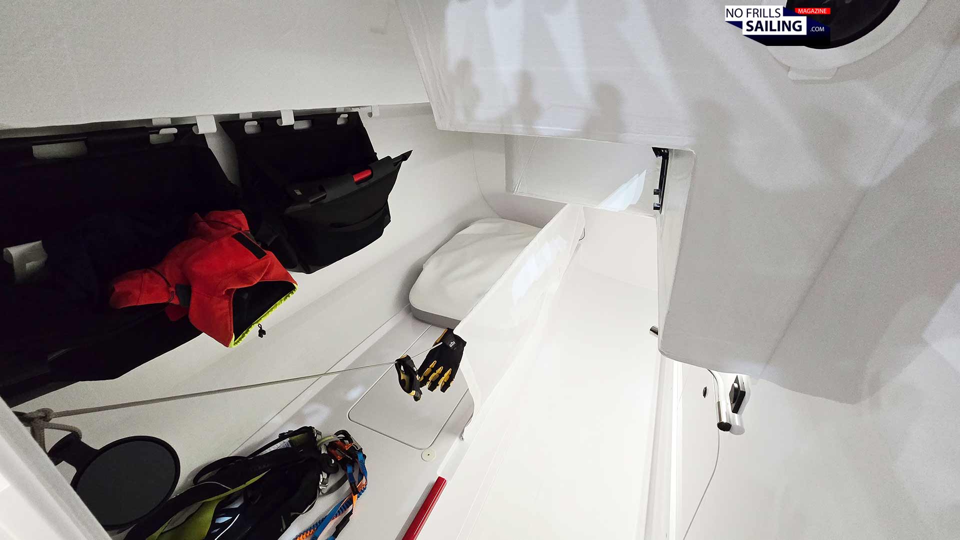As you may already guess, Seascape has taken out every single piece of wooden furniture. There are no cabinets for clothes anymore. Instead – and I really appreciate this, rejoice! – there are the ingenious First carrier bags. You may be familiar with these from the First 24 SE and/or the 27 SE. Easy to use, extremely practical and so simple, yet highly practical, those carrier bags are a signature feature of Seascape and embody best their “simple, cool and useful”-approach to cruising comforts.