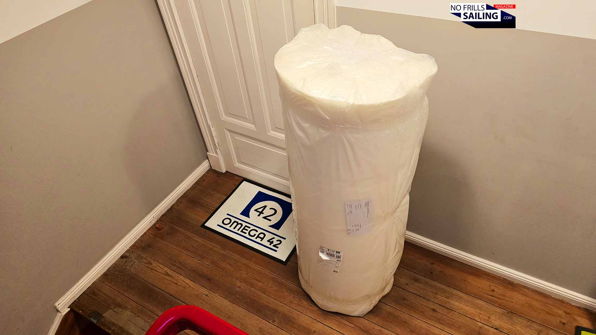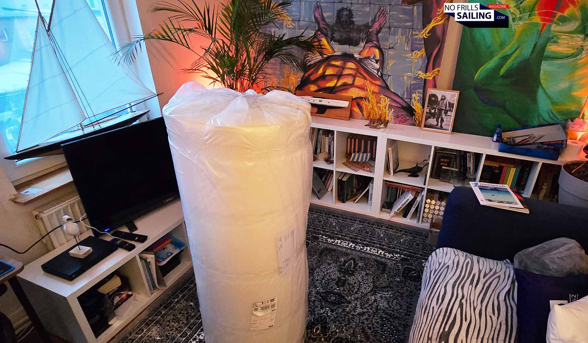 Rrrring! Rrrrring!, makes the bell of my flat. As I open it, a poor delivery guy is hauling an oversized round package up the stairs. I sign and thank him: Here we are, the next self-test arrived! You may remember my article about meeting the upholsterer who took the measurements for the custom made mattresses and salon cushions for my new boat? If not, check it out here, it´s interesting. Anyway, as we were talking about how I will use the yacht and who will be mostly sleeping where, we also discussed about materials, thicknesses, hardness degrees and – of course – prices.