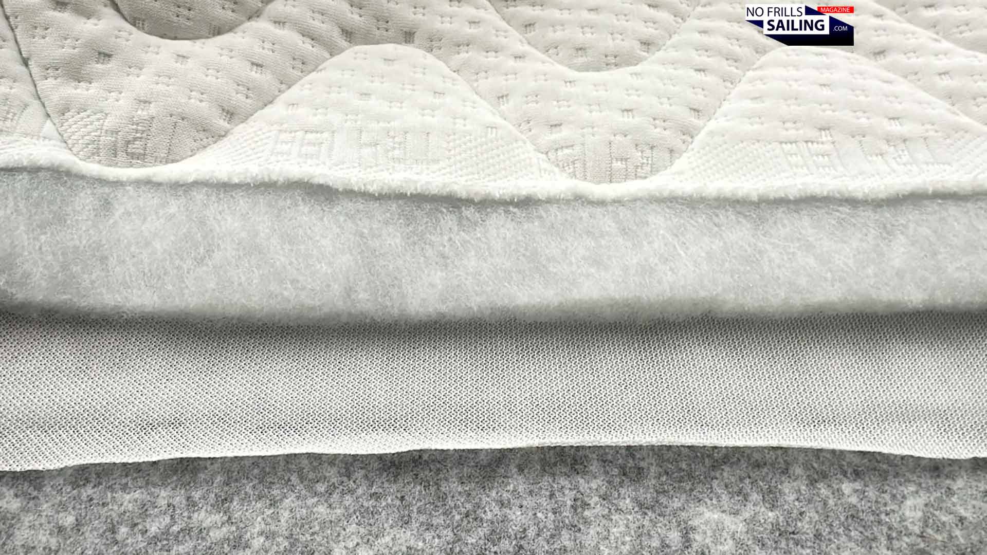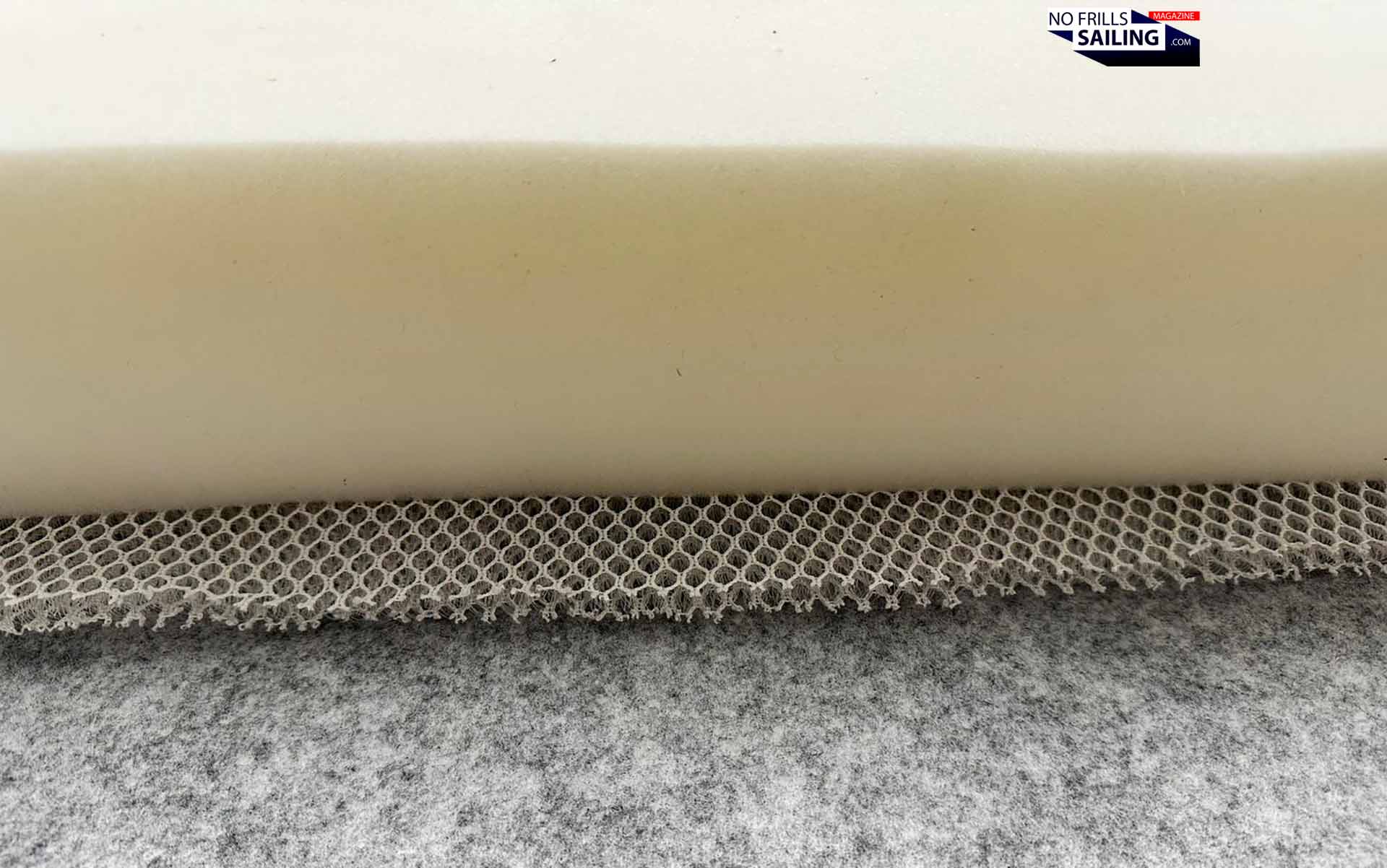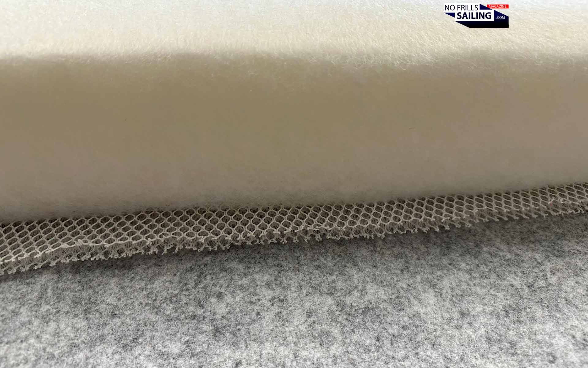 As for my boat´s cushions, the budget is fixed. It amounts to several thousand Euros. So in one hand I´d like to get the best quality there is, on the other I´d love not to drain my poor ban account completely because of cushions. Markus explains therefore, that he will apply only the needed and obligatory layers and let go of the luxury bling. At last, my blog is called “no frills sailing”, right? So the first layer and one of the most important is a spacer fabric. It´s a 3D-mesh that is both flexible but also durable. I know this stuff quite well: For my last boat, the small First 27 SE I retrofitted this to the sleeping-cabin after I realized that a load (!) shit of water – well, sweat it was! – accumulated underneath the mattresses after each night in summer. So that´s one of the most important things for yacht mattresses!