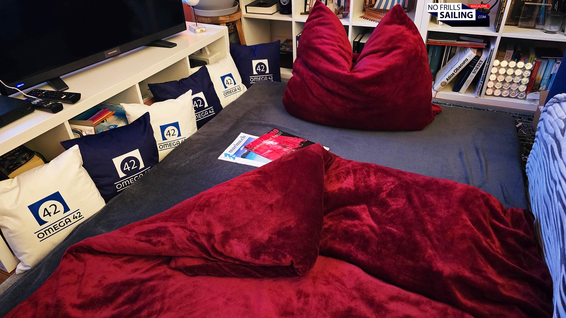 Well, I´m missing the gentle seesaw of a moored boat or the sometimes rocky but naturally rhythmic pattern of a boat sailing through waves, but it feels quite comfortable. It´s not my home bed (which is luring next door), but it´s surprisingly comfy. So I prepare this makeshift bunk for the night, get my regular pillow and blanket into the living room, garnish everything with some Omega 42 boat show pillows and wish myself a good night: My first overnighter on my future mattress.