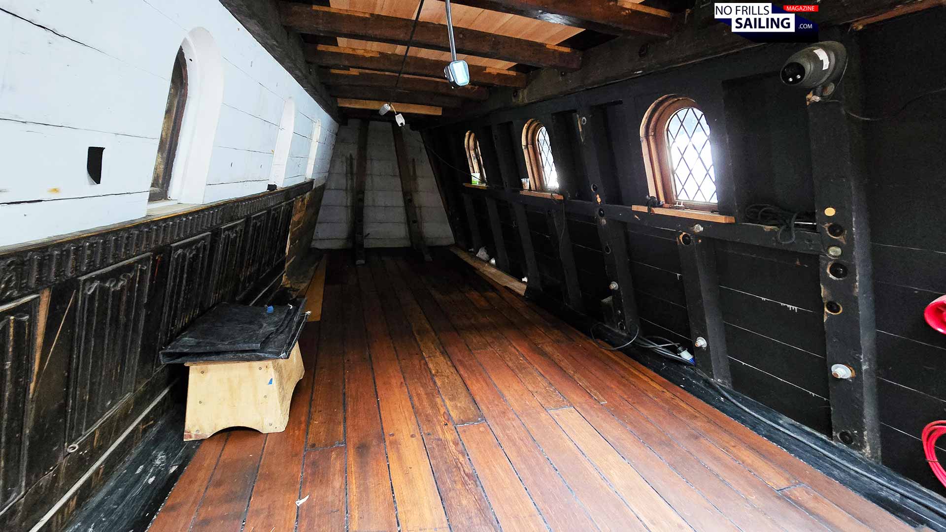 I roam the gun deck from stern to bow. It´s quite amazing to look at these massive frames, huge pieces of wood. Especially the bow section fascinates me: This is where the ship would crash-bang into the harsh waves, where mechanic torsion and strong loads would be bearable the most. The long, massive bow sprit runs down entering from outside, attached at its foot to the strong frame of the ship. The ceiling is secured by hanging and horizontal “knees”, bent-grown Oak parts, specifically sought after by the shipbuilders and carpenters of that time. Of course, the modern GOLDEN HINDE utilizes modern steel anchors and huge nails to further secure this framework.