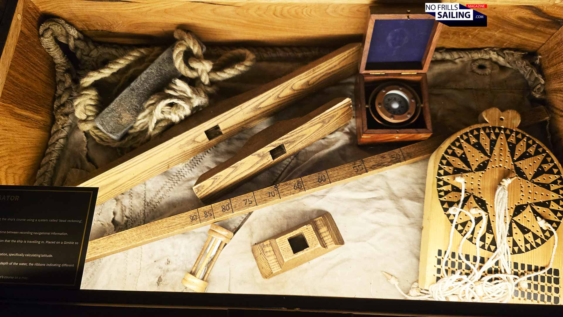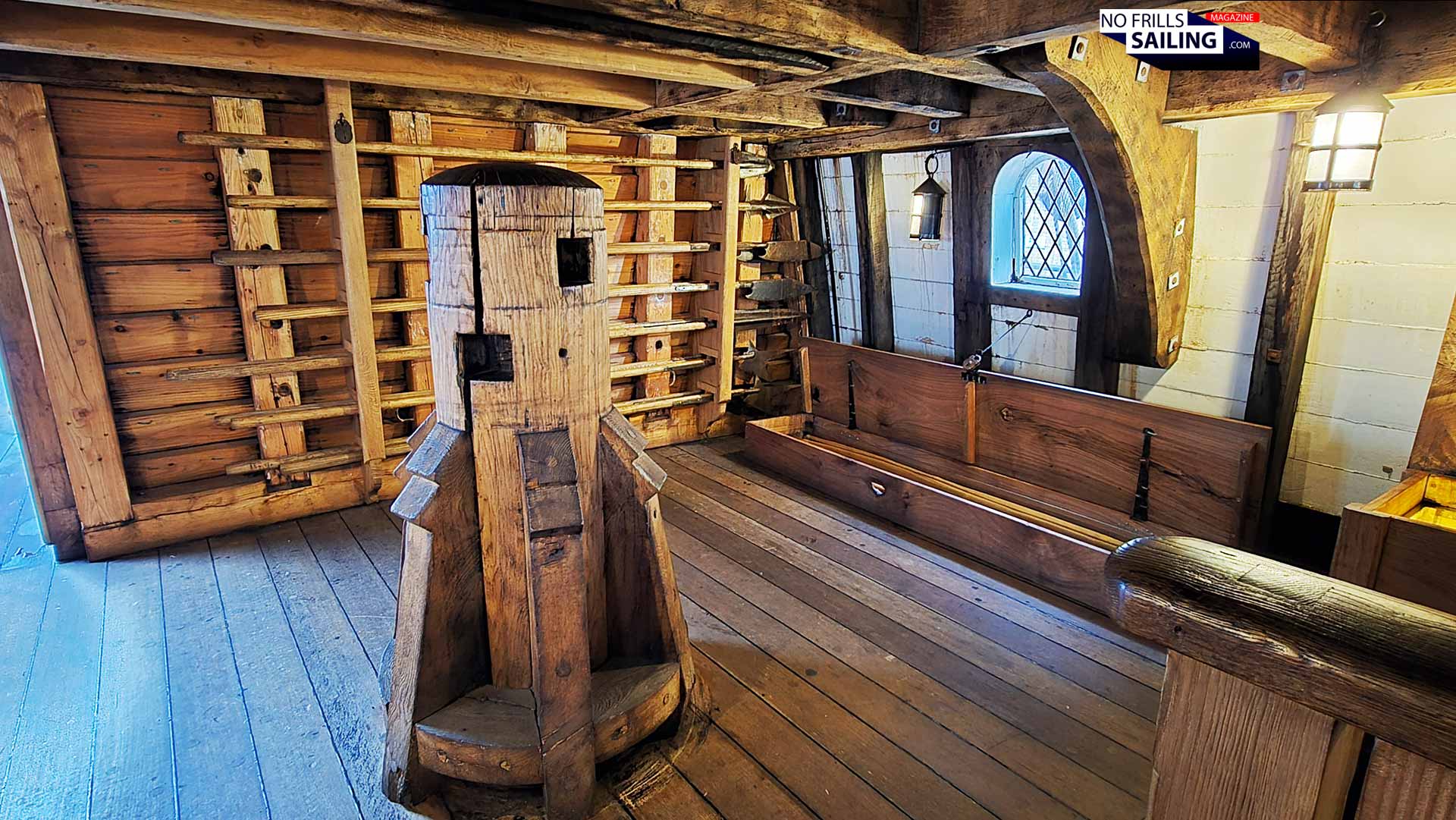 What really surprised me was the standing height down here. Or, let´s call it better: “squatting height”. I couldn´t find the exact number and didn´t bring my ruler, but I´d say the headroom of this deck is lower than 1.50 meters. Look at the picture below: My fiancé posed for reference: It´s really backbreaking! On the gun deck, parts of the exhibition for the half deck and armory were on display, for example the first navigational aides of that time: Jacob´s staff, astrolabe and a rough magnetic compass.