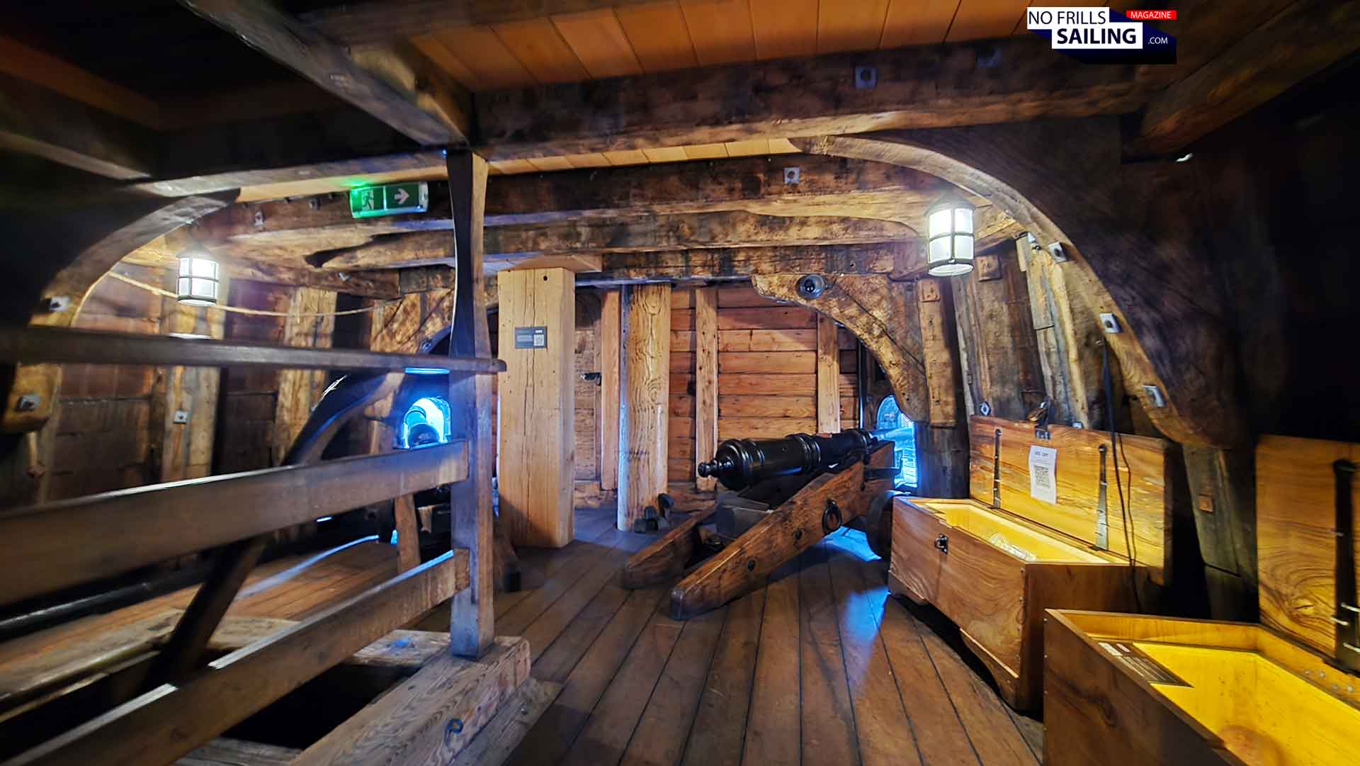 The adventure started by going down into the first enclosed deck. The gratings had been closed with thick canvas – I guess that was due to the winter months and maybe these are open during the dry summer´s months – so we were greeted with a dim light, most of the gun deck lay in half-shadows. Of course the light sources were modern LED-lamps, but a little “flickering” effect of those would have contributed to the impression of real candle-light or oil lamps, which had been in use for that time.