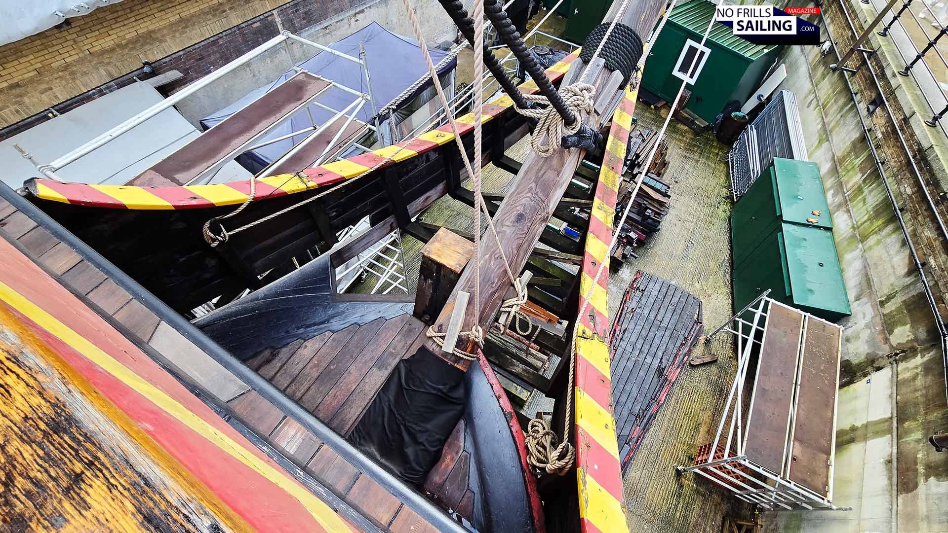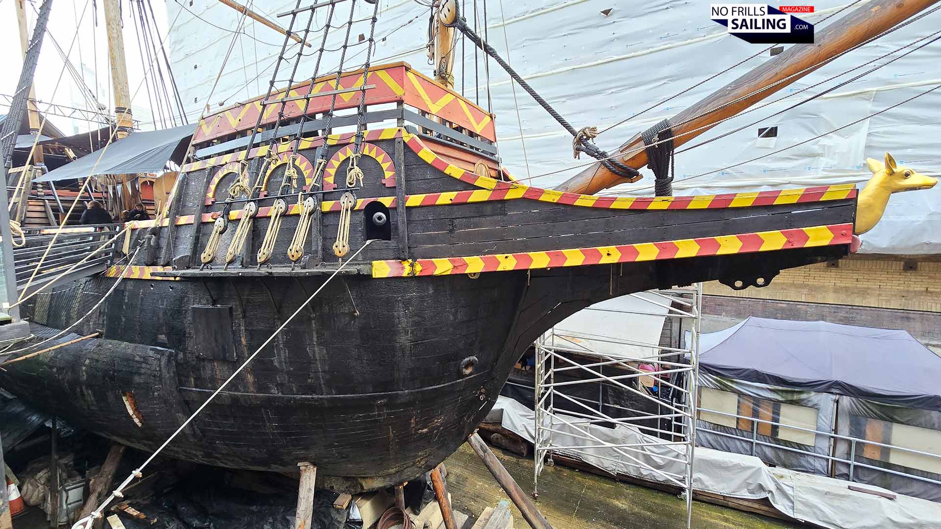 As renovation of the GOLDEN HINDE is an ongoing project, the current round of works had started almost ten years ago. It is undeniable that most of her outward appearance is currently obstructed by scaffolding. The beautiful coat of arms, once the proud grace of her transom, has been dismounted and put aside. The motto of the ship Cassis Tutis Sima Virtus means “Virtue is the safest helmet” is nicely readable.