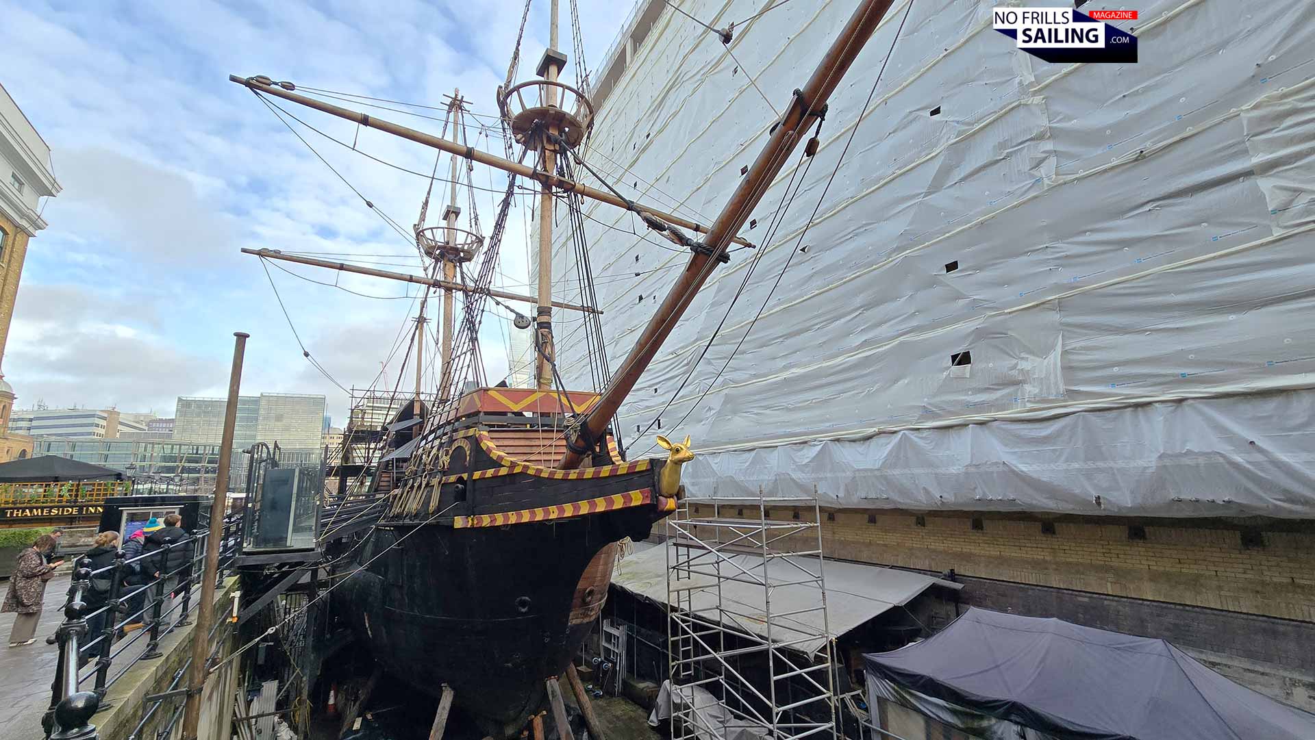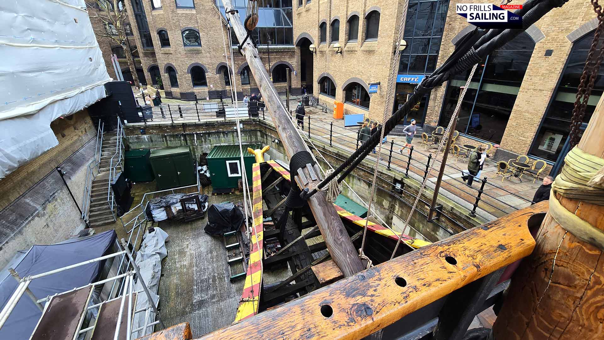 It´s not hard to find the museum ship nor is she far away. You do not have to take the tube to reach her nor do you have to walk far. The GOLDEN HINDE is located just between London and Southwark bridges on the southern bank of the river Thames. Her place is called Saint Mary Overie´s Dock, right behind a thick barrier blocking off the river to flood her final resting place. In this, she´s easy to miss right now (February 2026), as there is heavy construction going on, kind of “hiding” the ship a bit.