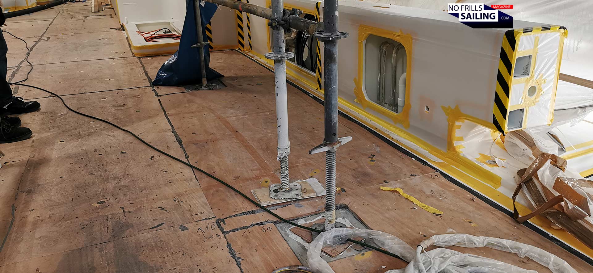 On the sides the guys have already sanded the deck, taking away the overlaying Sika caulking. This is because works to make the coamings are about to start soon here. After all installations have been done, it is now time to add to the deck what later will become pure eye-candy. It´s a quality sign and pride of any ship´s. The efforts that go into the coamings, be it the surrounding “outline” of a deck, the curves around bent superstructures, the coaming around a head or hatch, these efforts define the class and beauty of a yacht´s deck.