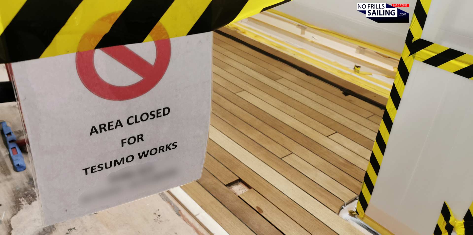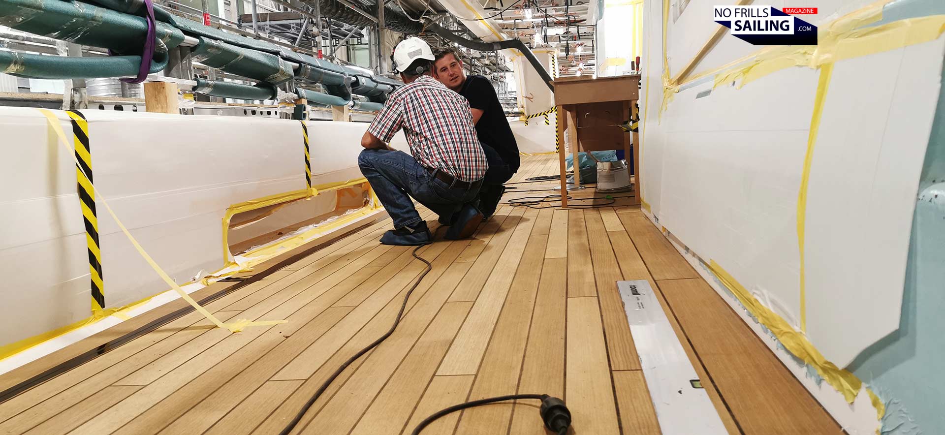 First of all, the Tesumo planks are brought onto the boat to a workstation near the area that is about to be covered with it. The individual planks are already pre-processed in the shipyard´s joinery (which we will visit later in this article). The trained eyes of the joiners will select the planks according to their color grading and grain structure. The idea is to have a nice looking, homogenic surface impression on the one hand, but also a “shiplike” attractive look.