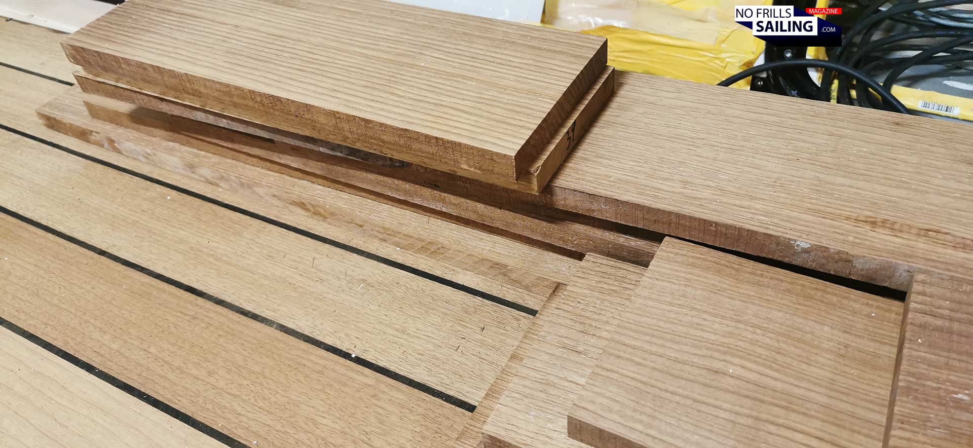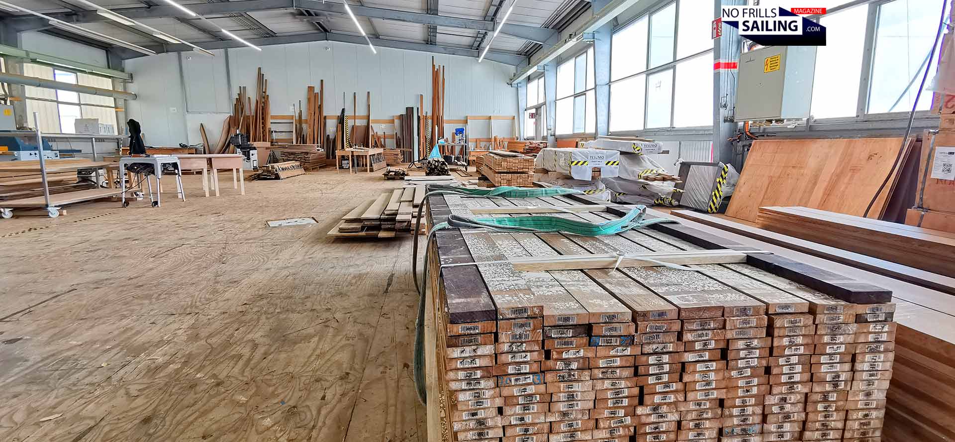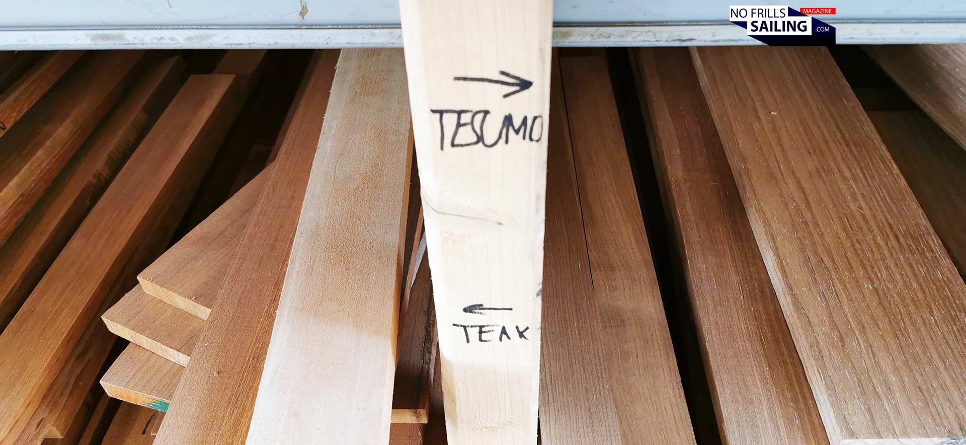 I guess that is something the R&D department of Bernhard is still researching on? He points to a storage of ready-to-install Tesumo planks. The numbers indicate the length of them, in this case ranging from 3 to 3.3 meters. “That´s another hurdle we have to overcome”, Bernhard tells me: “Tesumo has less elasticity than natural Teak. This means, its capability of being bent to follow sheerlines and curves is limited.” Finding a good balance between the plank´s thickness (to prevent it from crumbling) and it´s sleekness to achieve a certain curve is paramount. He points to the cross-sections of the planks.