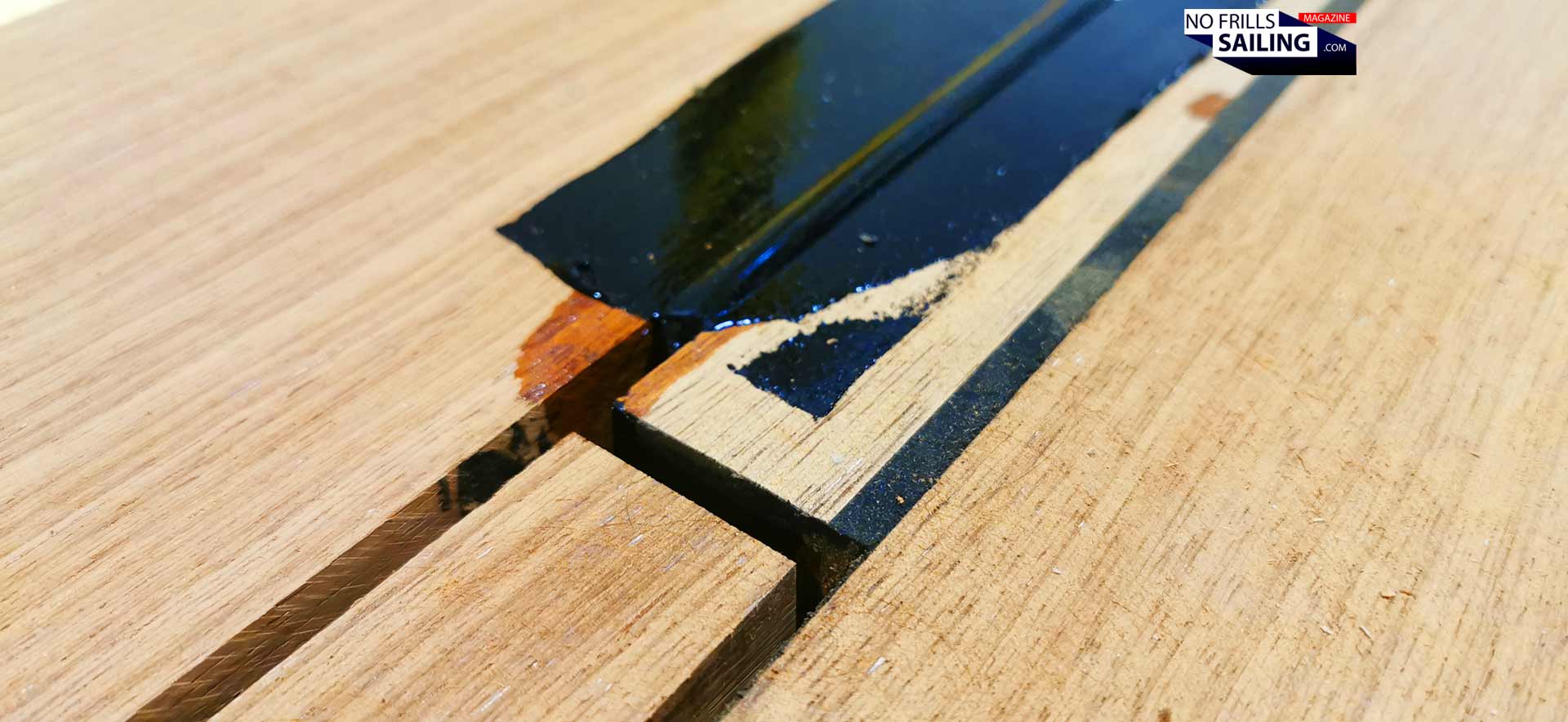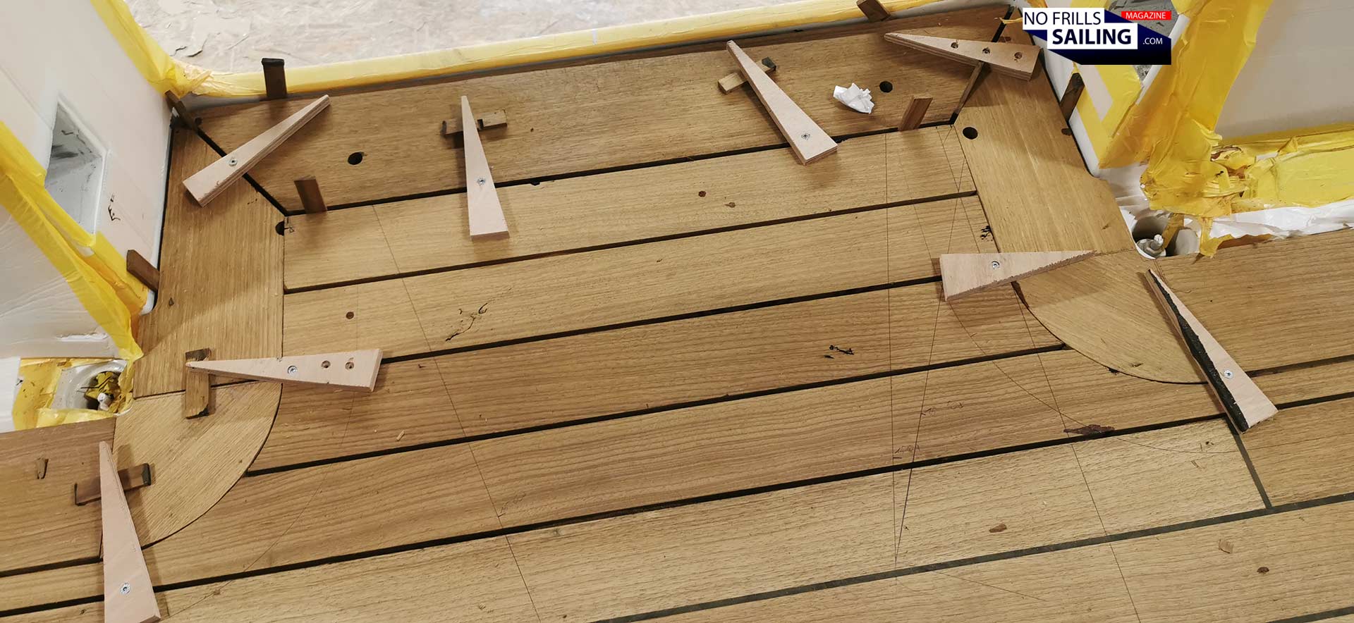 And it is really done as they have done it for centuries in the old days: One plank after another. Utilizing another special marine glue and precision cut spacers, the planks are put in a special pattern onto the plywood-layer. The guys double- and triple-check the seams, the distance from one to another and really take their time to achieve a perfect outcome.