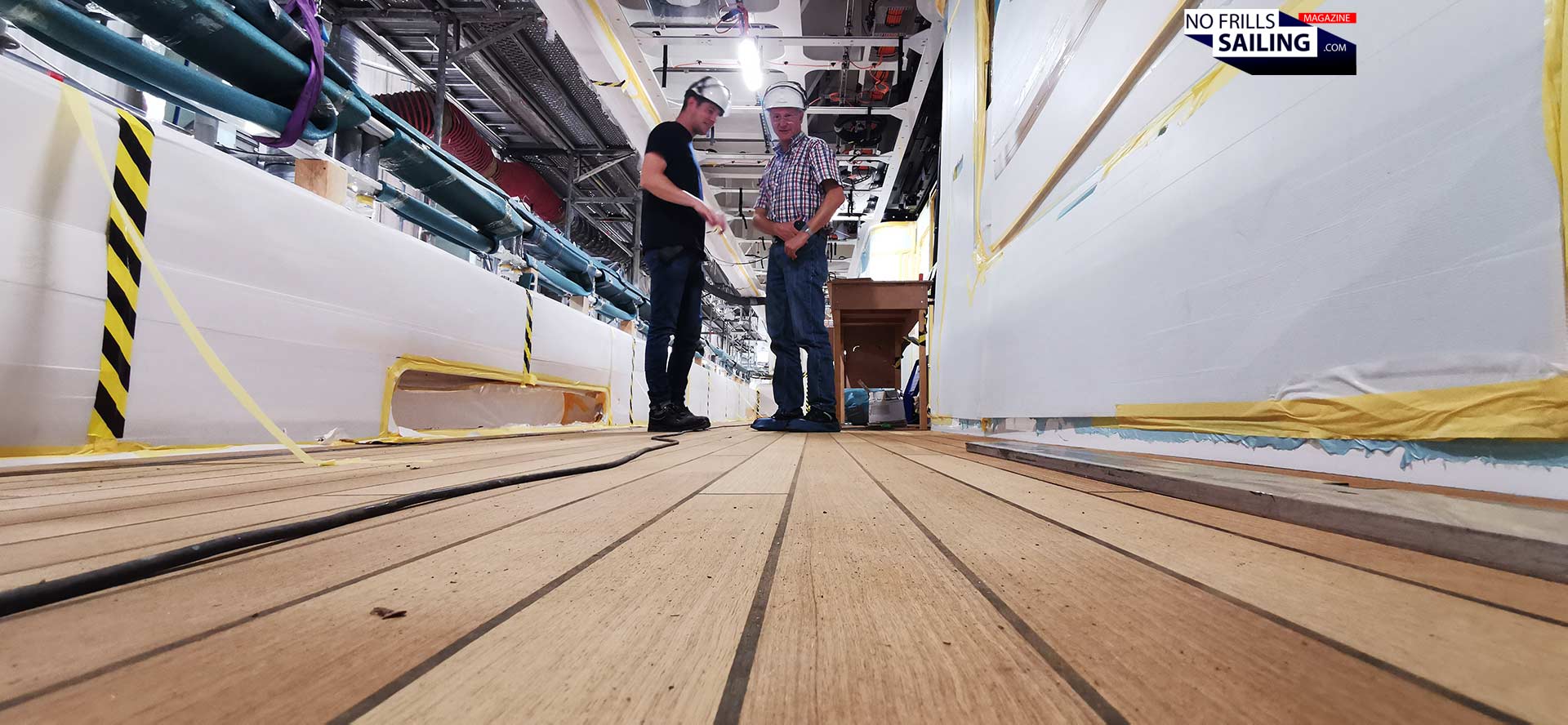 The area we visited first had just been approved and is considered almost finished. There will be last touches of work, then the protective layer of plywood will also be installed and not taken away just shortly before launch. As I walk over the deck, the feel was awesome. Totally different from an ordinary boat, which I guess has something to do with the boat´s material (steel) and the thickness of everything. In case of the planks, up to 33 millimeters! Checking the surface quality with my fingers, it was perfectly smooth. You could feel no grain, no irregularities and of course not a single splinter or defect. Just perfect. I mean, look at the pictures: It almost looks like a computer rendering!