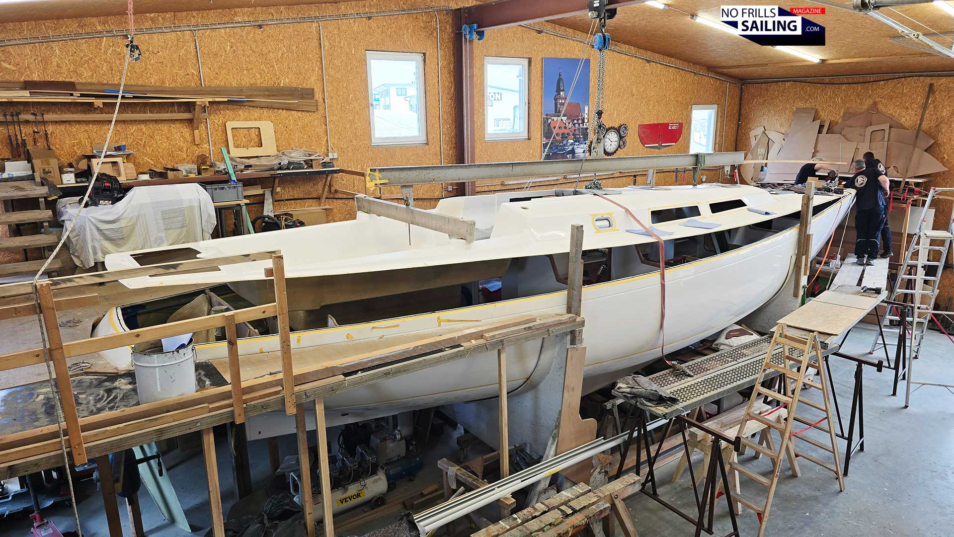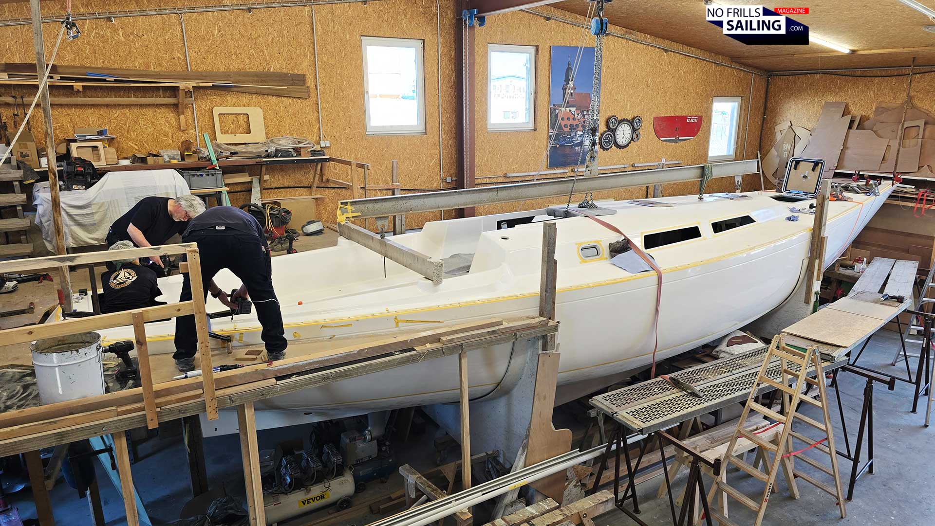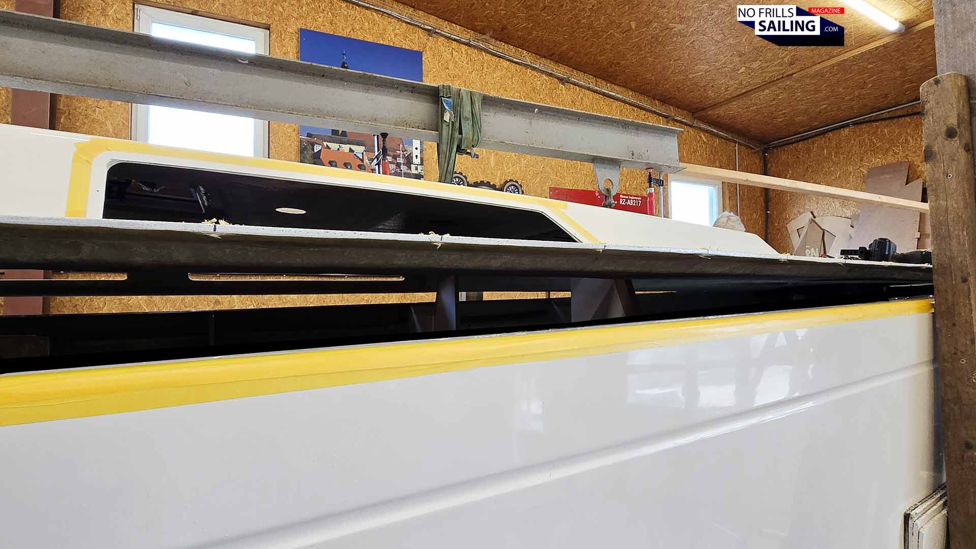 But why all the fuzz?, you might think. It´s basically just a lid that is put on the pot, right? Well, not quite. See, first of all, no hull and no deck – no matter how hard you try – are really 100 per cent symmetrical. Maybe today´s CNC-milled molds are, but as you know, the Omega 42 had been laminated in the one original mold where all of the other 160 classic yachts were born in the eighties and nineties. In fact, you can easily spot minor inconsistencies. Correcting those, a work of fractions of centimeters, took a significant part of the preparation in the past days. Inside of the boat, large steel shaping formers spread and squeeze the hull to a near-perfect symmetry.