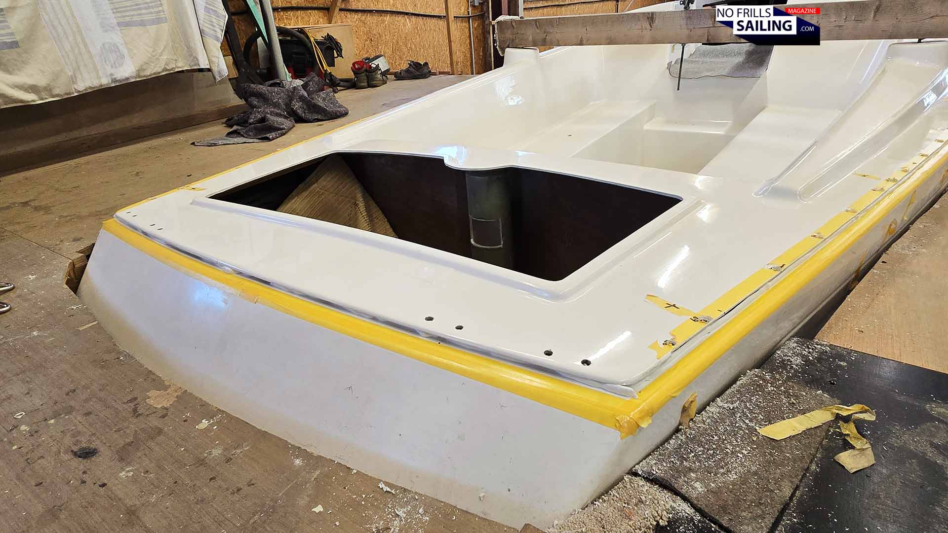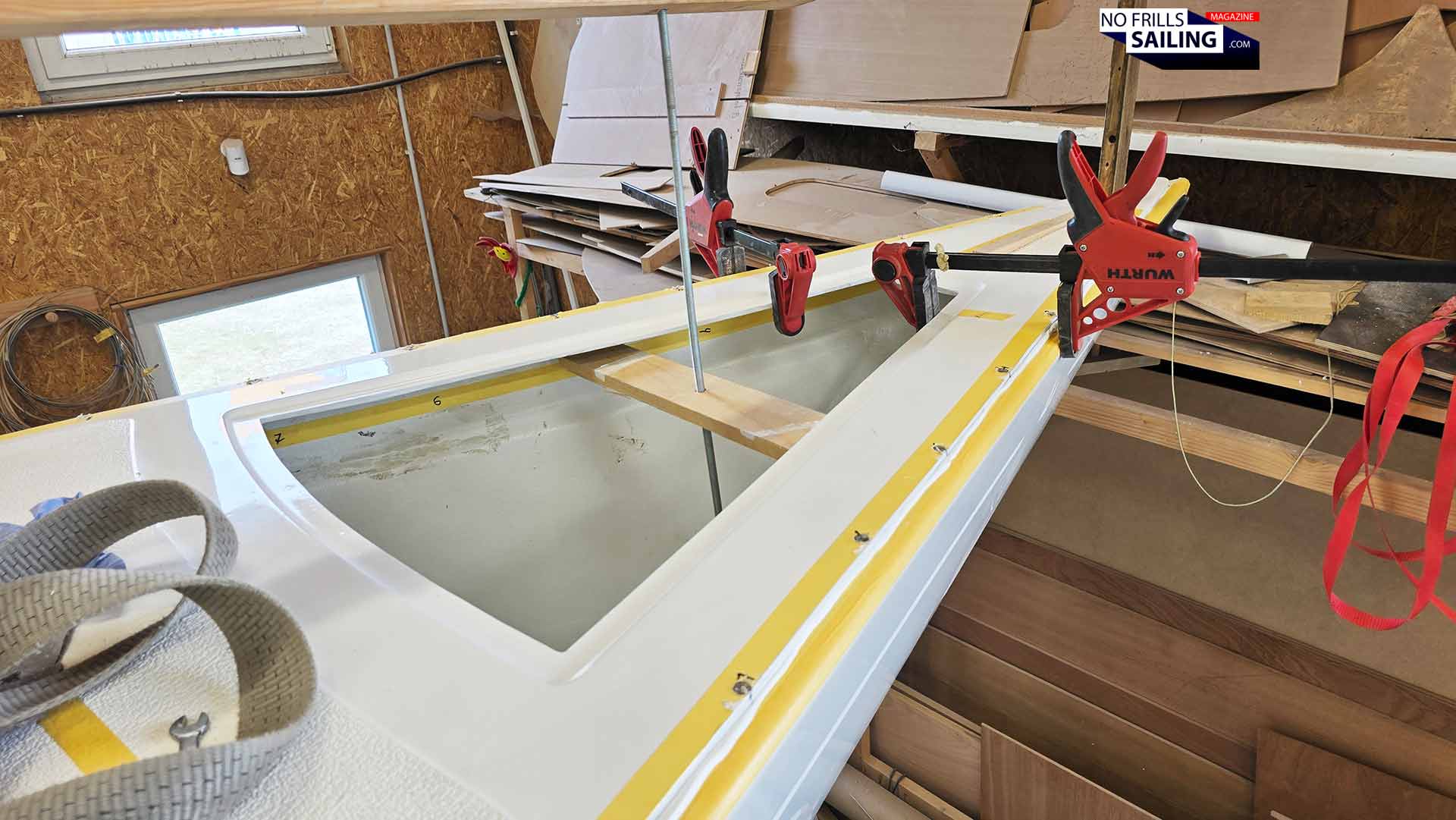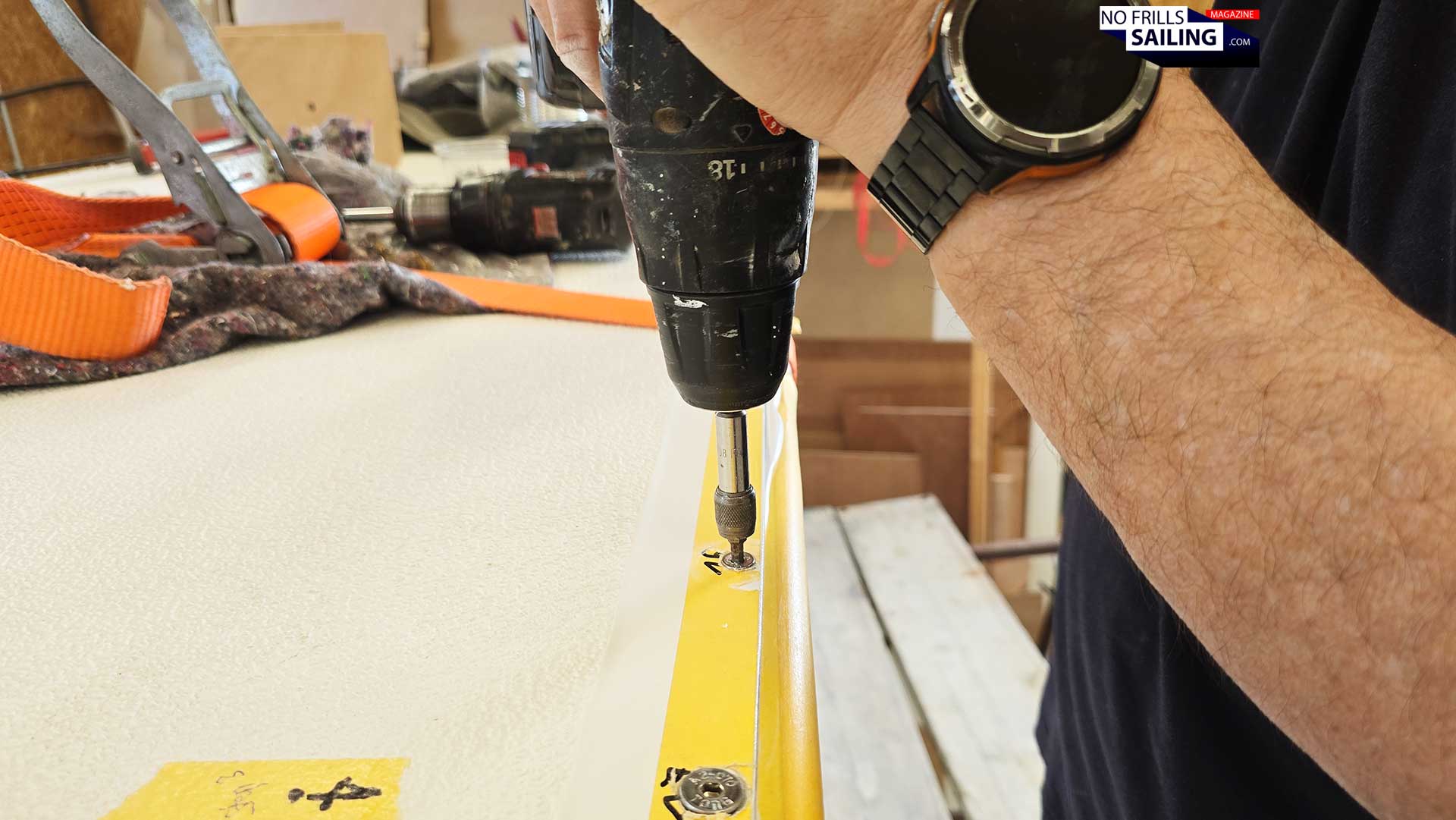 What follows after hull and deck are brought together is no less than a race against time. In a distance of approximately 20 centimeters the time had been marked the positions of the bore holes. Clever: Both outside all along the deck line and inside the boat. The yellow masking tape, initially intended to protect the gelcoat from surplus glue, carried the hole numbers from 1 to 60 from bow to stern. During the past days of preparation, the team had already had the deck sitting on top of the hull, drilling those holes.