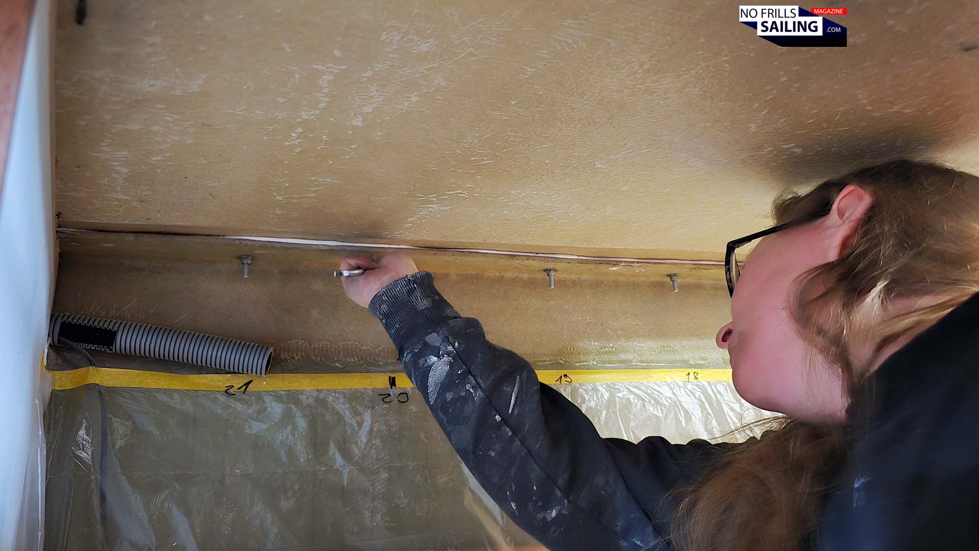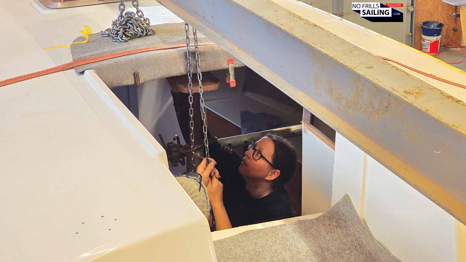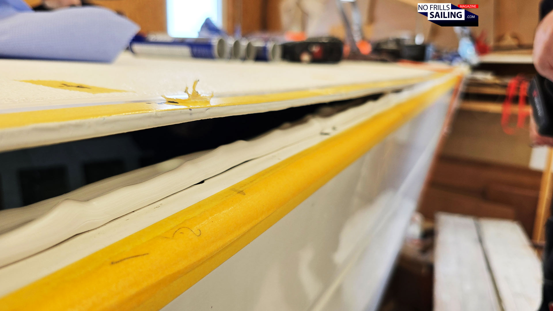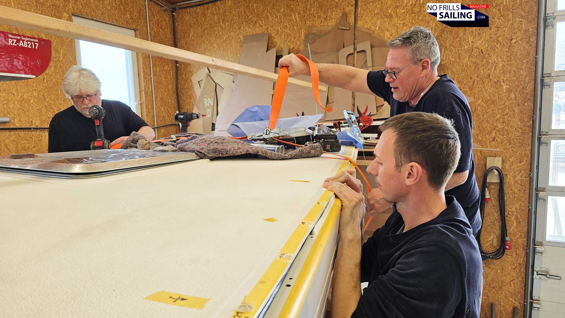 That said, time is crucial here. Which by the way was initially one of the reasons why the shipyard wanted to stick with the good old epoxy-resin. By putting in more or less hardener the time which the glue needs to dry through and bind together hull and deck could have been adjusted: More hardener, and the reaction-time is reduced, less hardener, and the more time the guys will have for the second step of the undertaking: Putting in the bolts and nuts. Now, by utilizing the Sika-product, there is just that amount of time in which it all has to be done.