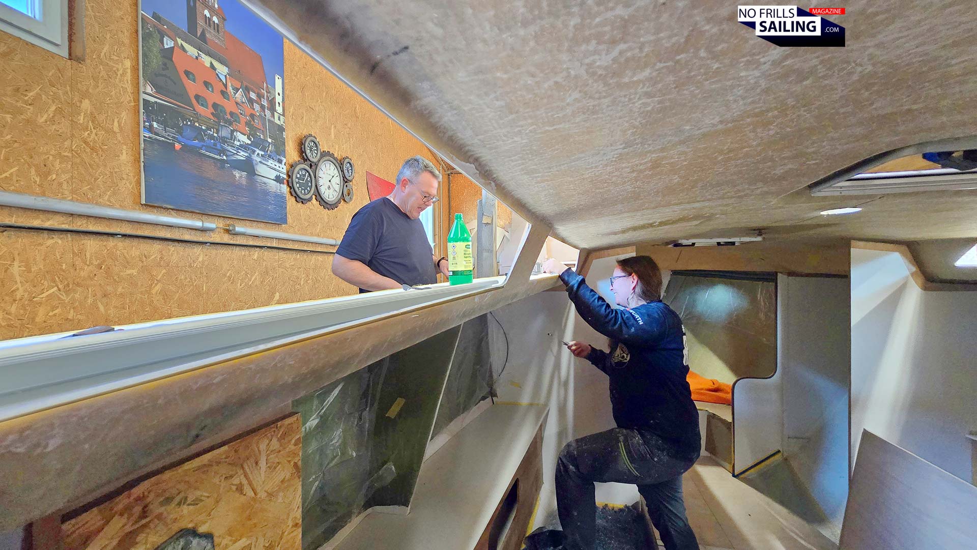 As we have spring time now coming up in Germany as well, temperatures were rising. You can imagine the heat inside the boat when two people are working together in such a cramped, mostly dark environment! And not forget the odors: I am a big fan of the GRP-related smells in shipyards, I must admit. But there´s a difference between a shipyard-visit and working with chemical agents in close proximity. In short: It stank sharply! But, amidst the circumstances, nobody murmured or held back. They did their best and sped downrange from bow to stern.