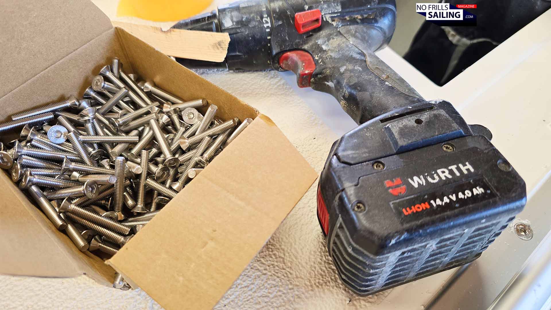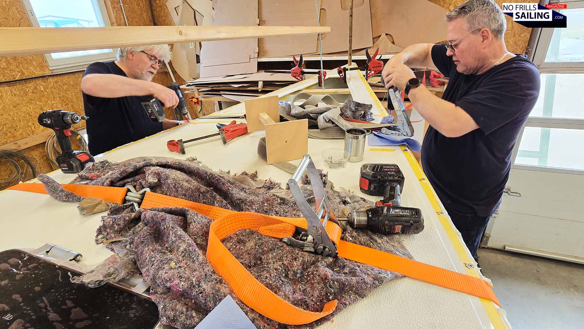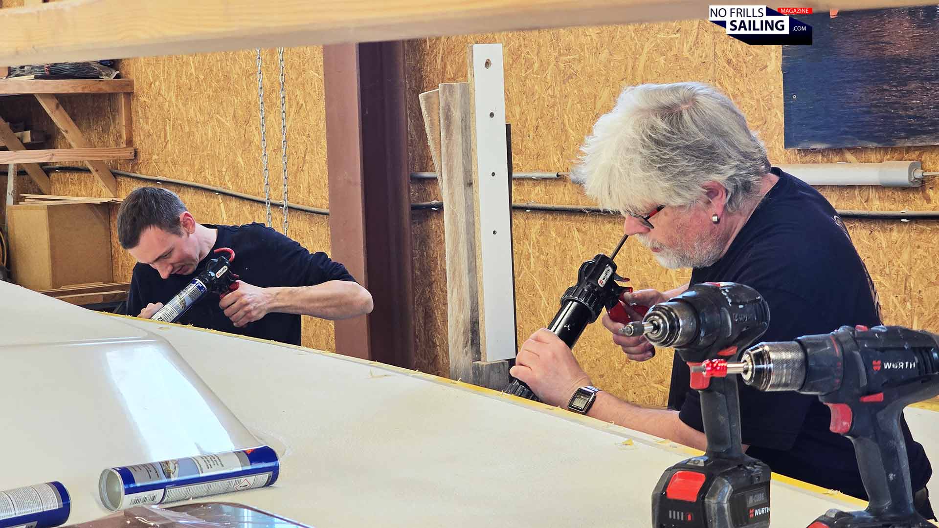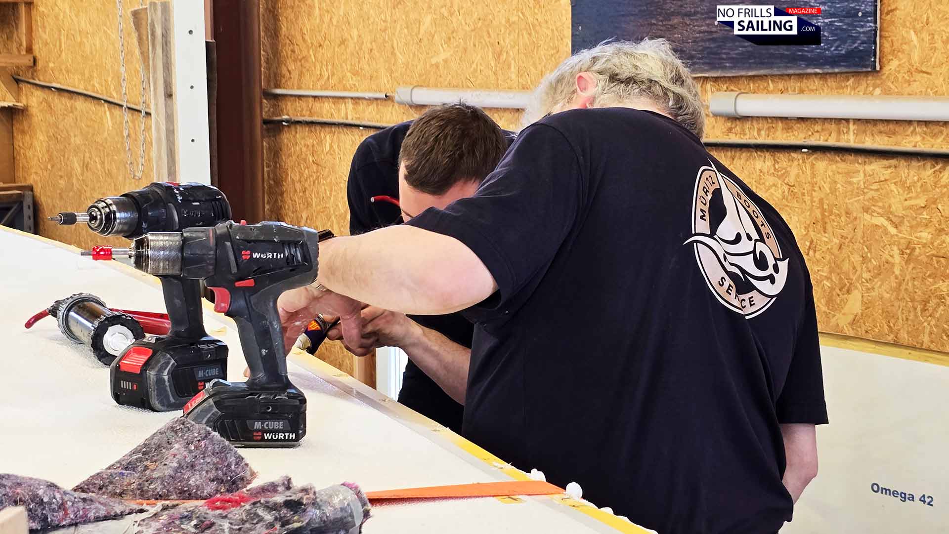 In fact, it turned out they would utilize the best of both worlds: Chemical bonding and mechanical means. As Heiner told me, the first new Omega 42 had been bolted and glued together, which worked out just as fine. After consulting the external specialists from Yachticon, general importer of Sika-products, he decided to switch from epoxy as bonding agent to a Sikaflex-product. That is why a handful of caulking guns had been prepared with their cartridges, a number of cardboard boxes filled with dozens of cartridges were opened and made ready for use.