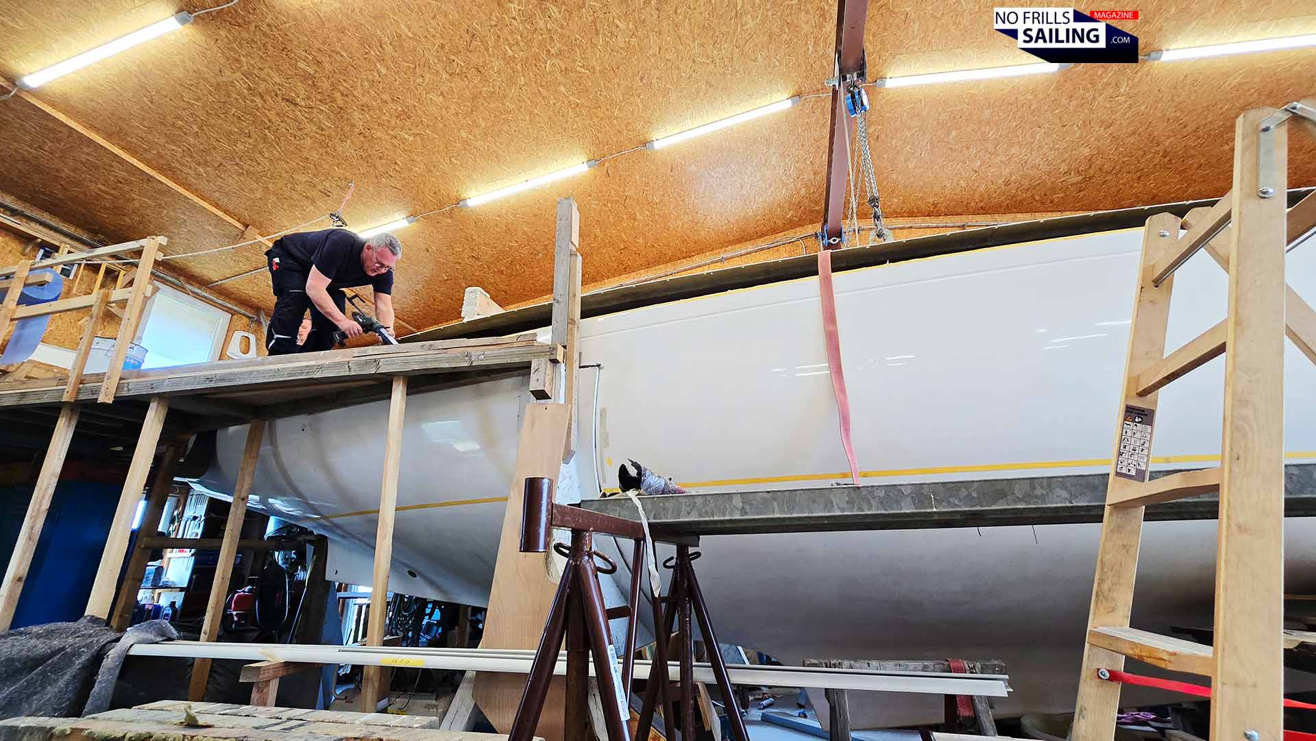 Five people, fully focused and concentrated. I am still fascinated by the level of self-controlled and fully individual action as well as their concerted teamwork, hand in hand action and creative, instant reaction if someone needed the hand of another. I mean, these are skilled craftsmen, sure, but how often do they put a deck on top of a yacht? Moreover, of such a big boat? 42 feet is pretty big for Baltic Sea conditions. They have mastered it once, yes, but this was seven years ago! Many of the team members haven´t been working here at that time.