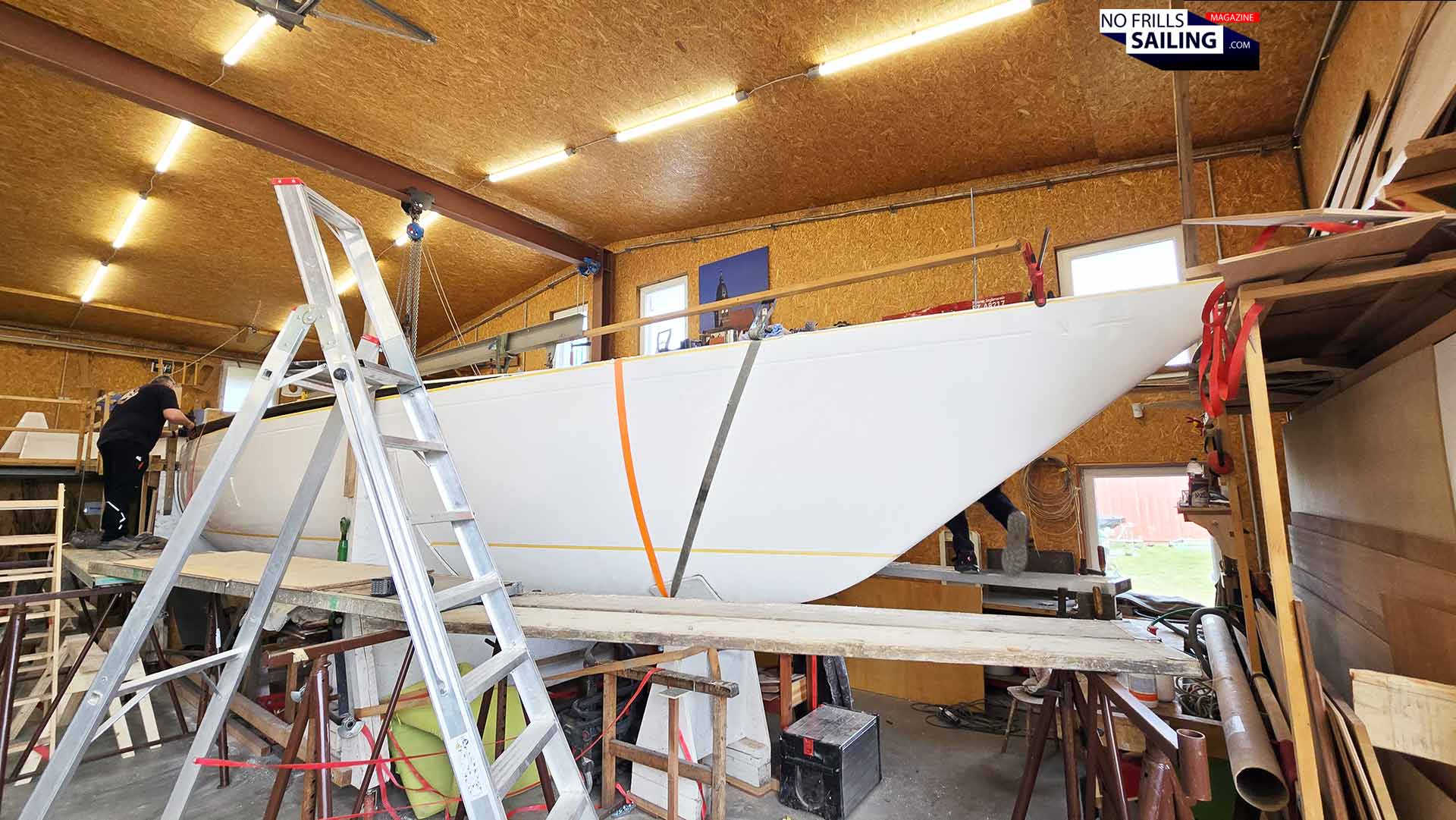 With a bit more distance between the boat and myself, I saw ALPHA in her full beauty. From her fine stern end to her extreme overhanging sharp bow. What a beautiful yacht this Omega 42 indeed is! As you can see, the cutouts for the windows had already been applied, which was a very special concern for me. It all makes so much sense now and the strive for the best possible outcome did really pay off – even now, in this very raw and rough condition, the timeless iconic shape of Peter Norlin´s legendary Omega 42 are present and electrifying the whole room.
