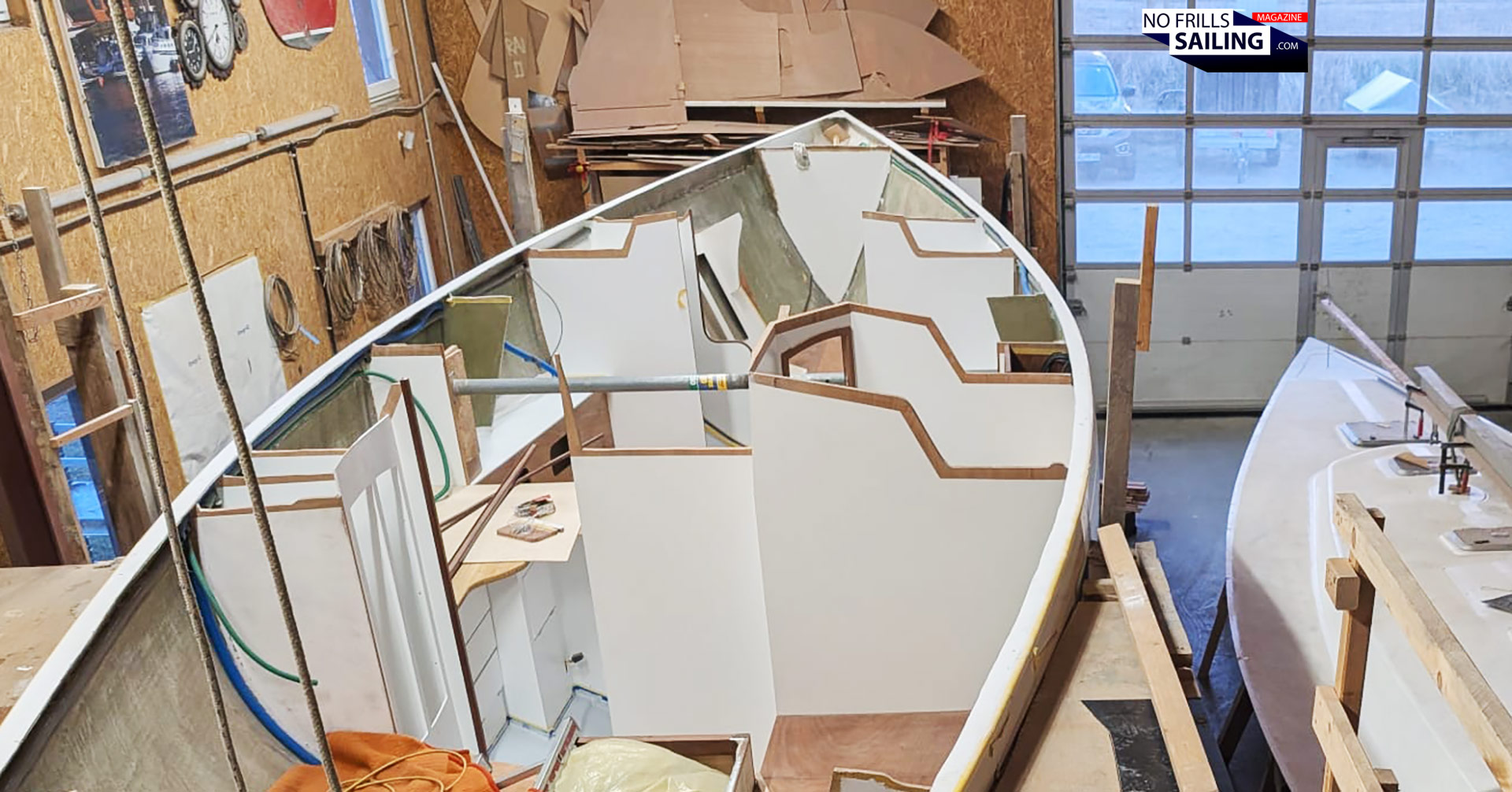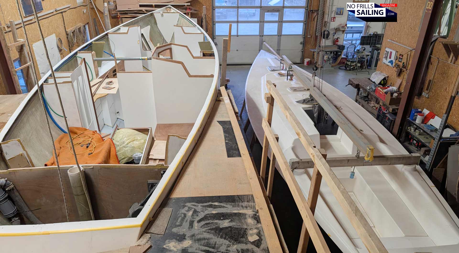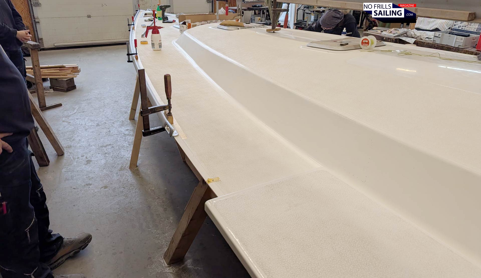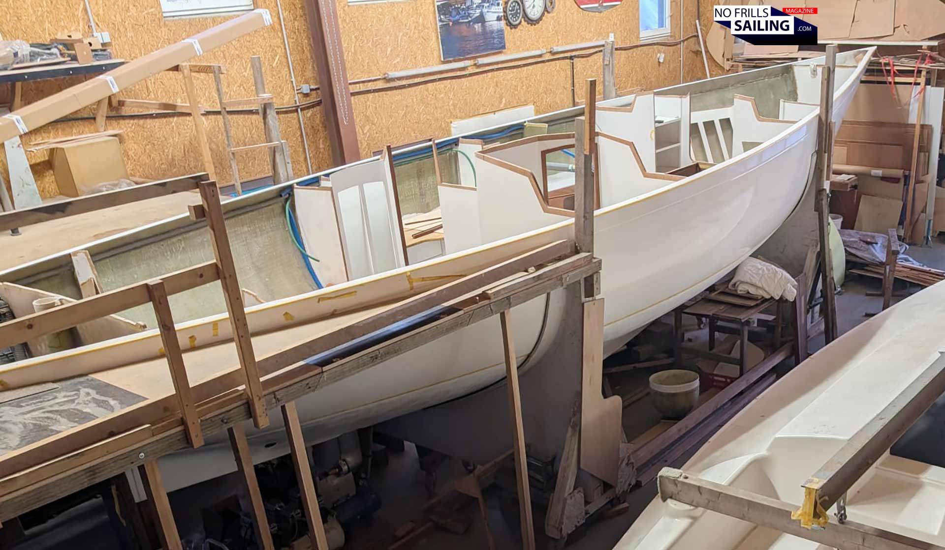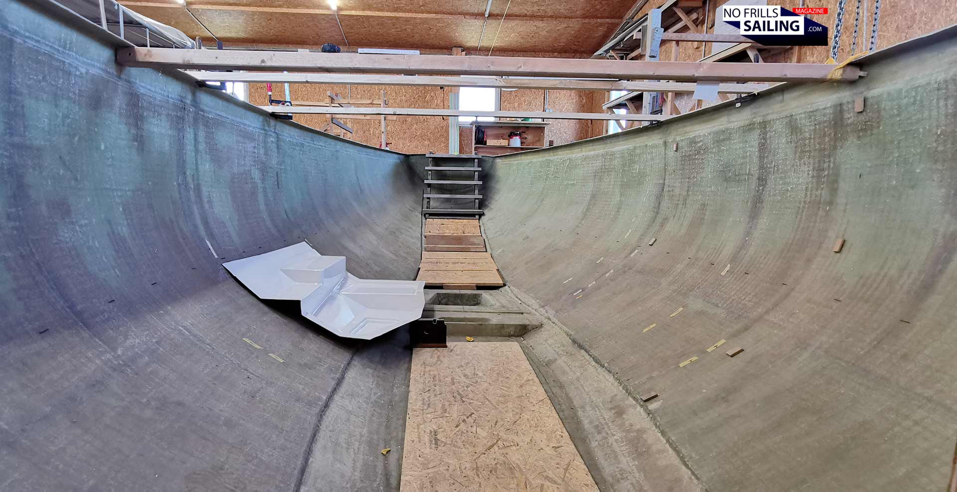 Yes and no. There are so many little things to be done before, I haven´t talked about: Like the thorough cutout of the aft storage or the opening for the anchor chain-locker in the bow. Again, this produces some dust and offcut that is vacuumed and wiped away thoroughly. The last picture I received this week, before the guys go into their well-deserved weekend, shows the shiny, clean hull with the huge overhanging stem and the prepared deck next to it: Ready to go for the big day!