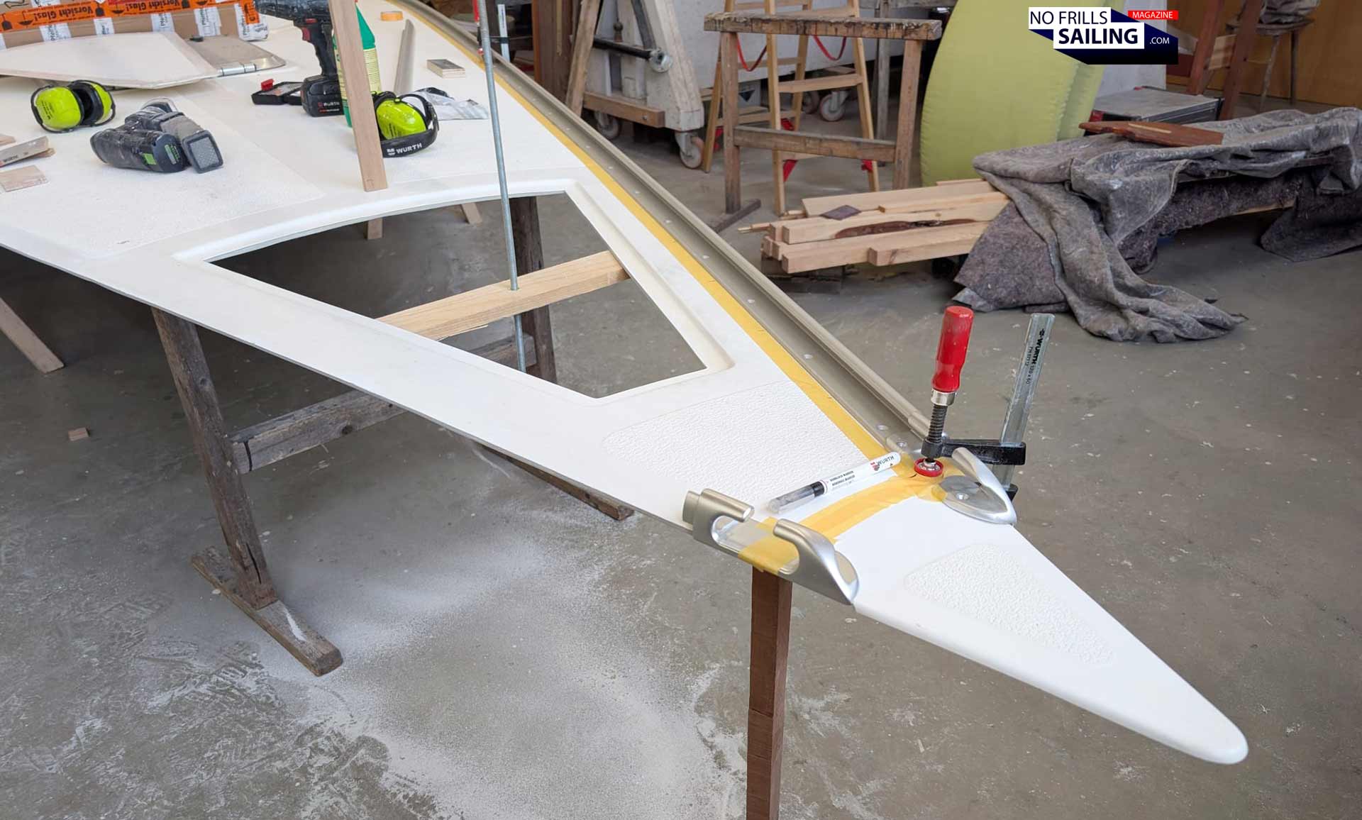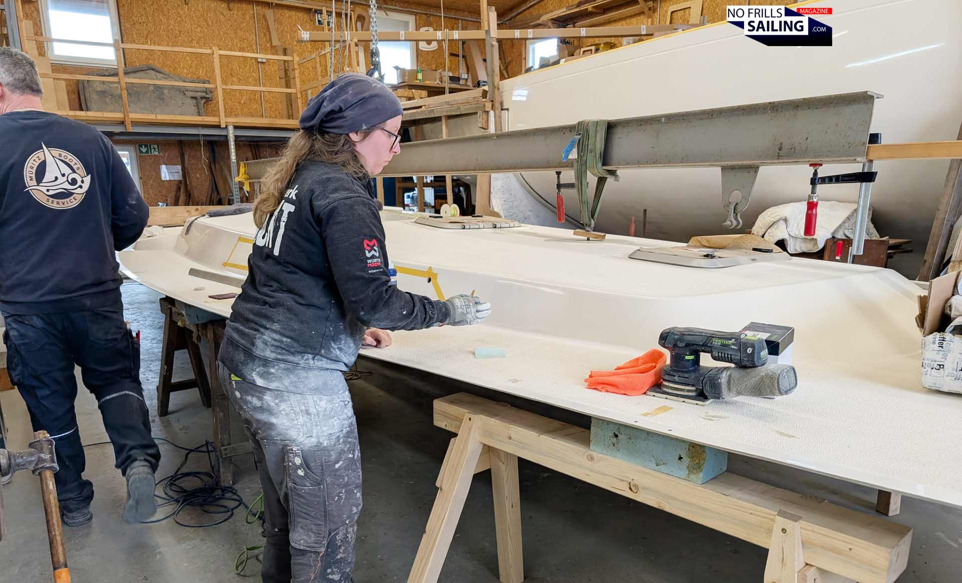 That´s a pity because it would have been very interesting to compare the techniques of the production boat companies to what my shipyard is doing. The first step is of course to cut both deck and hull into shape. When hull and deck are taken out of their lamination molds, the edges are usually much bigger than the actual component would need. This is done so that these parts would contains just the right amount of glass fibers and resin where the actual cut will be made, hence the right strength and material thickness. Also, if moved and damaged, it´s the overlapping material that gets the kink, not the actual hull or deck.