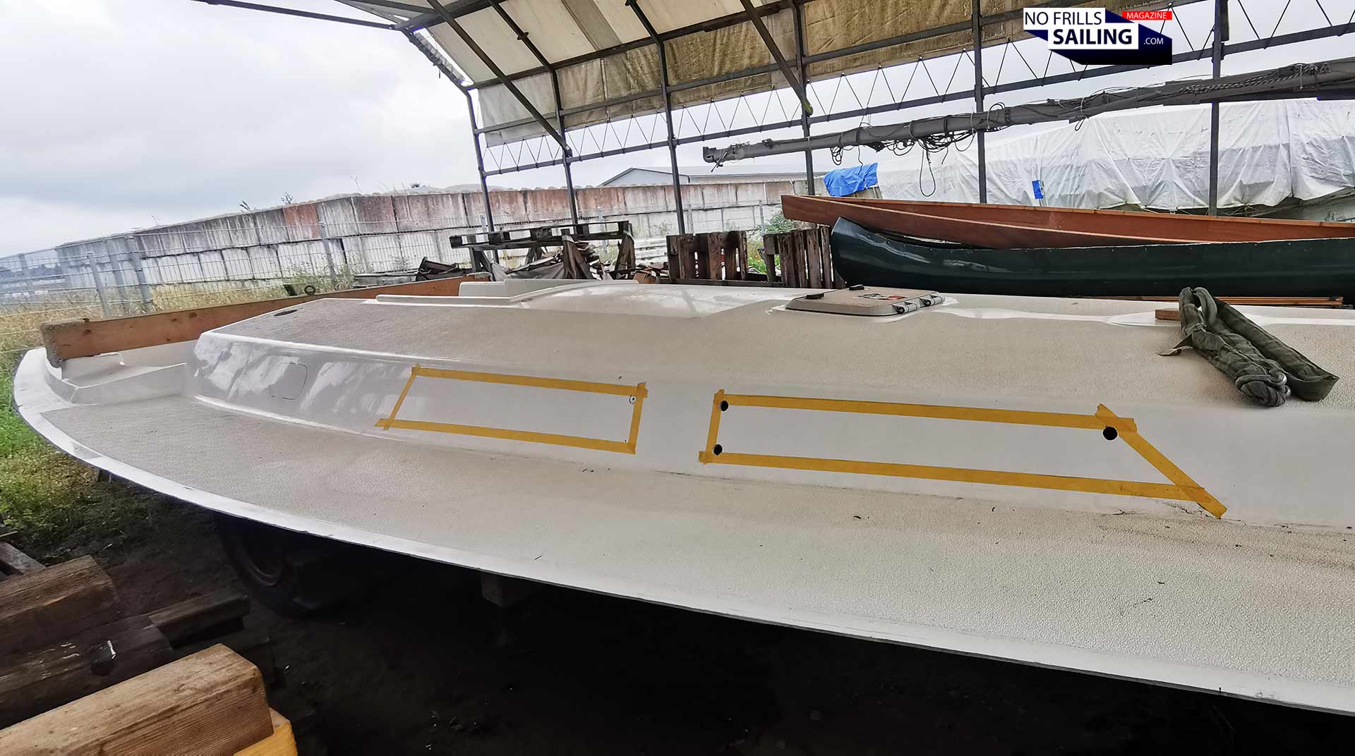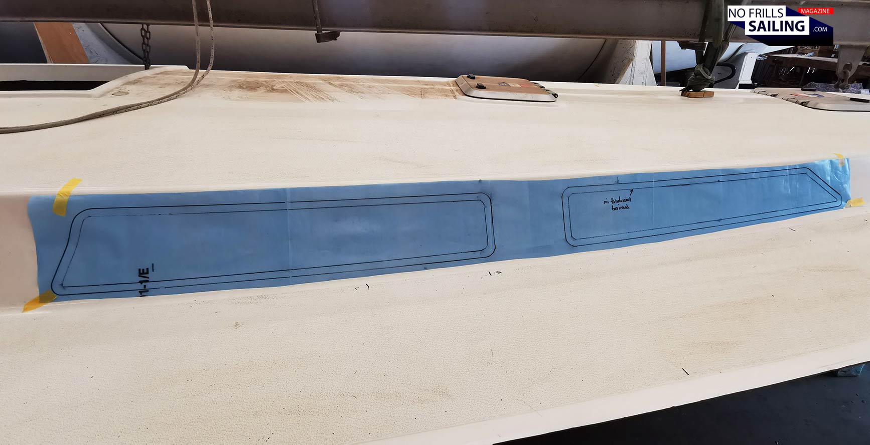 In order to nice and neatly cut out the windows, the guys brought the deck outside of the shed so that the rest of the workshop wouldn´t be buried underneath a layer of GRP dust. After transferring the outlines of the window shapes from the blue plastic film onto the deck, the cutting are was masked with some tape. On the one hand this is a nice indicator where to cut, on the other it prevents the remaining laminate from shattering at the cutting edge. They start by drilling holes, then the one guy with the calmest hands will use a saw to cut the straight, connecting lines.