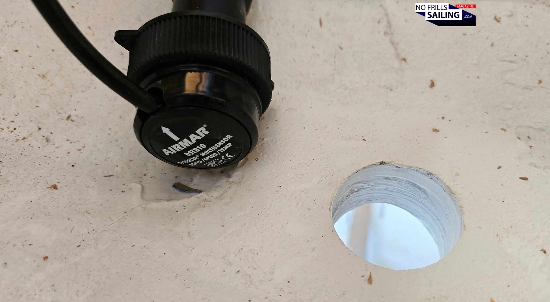 So that´s the status-quo for the windows. What else is going on? I guess the drilling party was already moving so they thought to keep it going: The hull-thru for the Airmar transducer unit had been bored. The guys also already sealed it with some fresh gelcoat as well. That said, looking at the hole reveals the thickness of the GRP-laminate in the bow area of the Omega 42, which is around two centimeters – back in the day, the boats were a bit more sturdy, for sure.