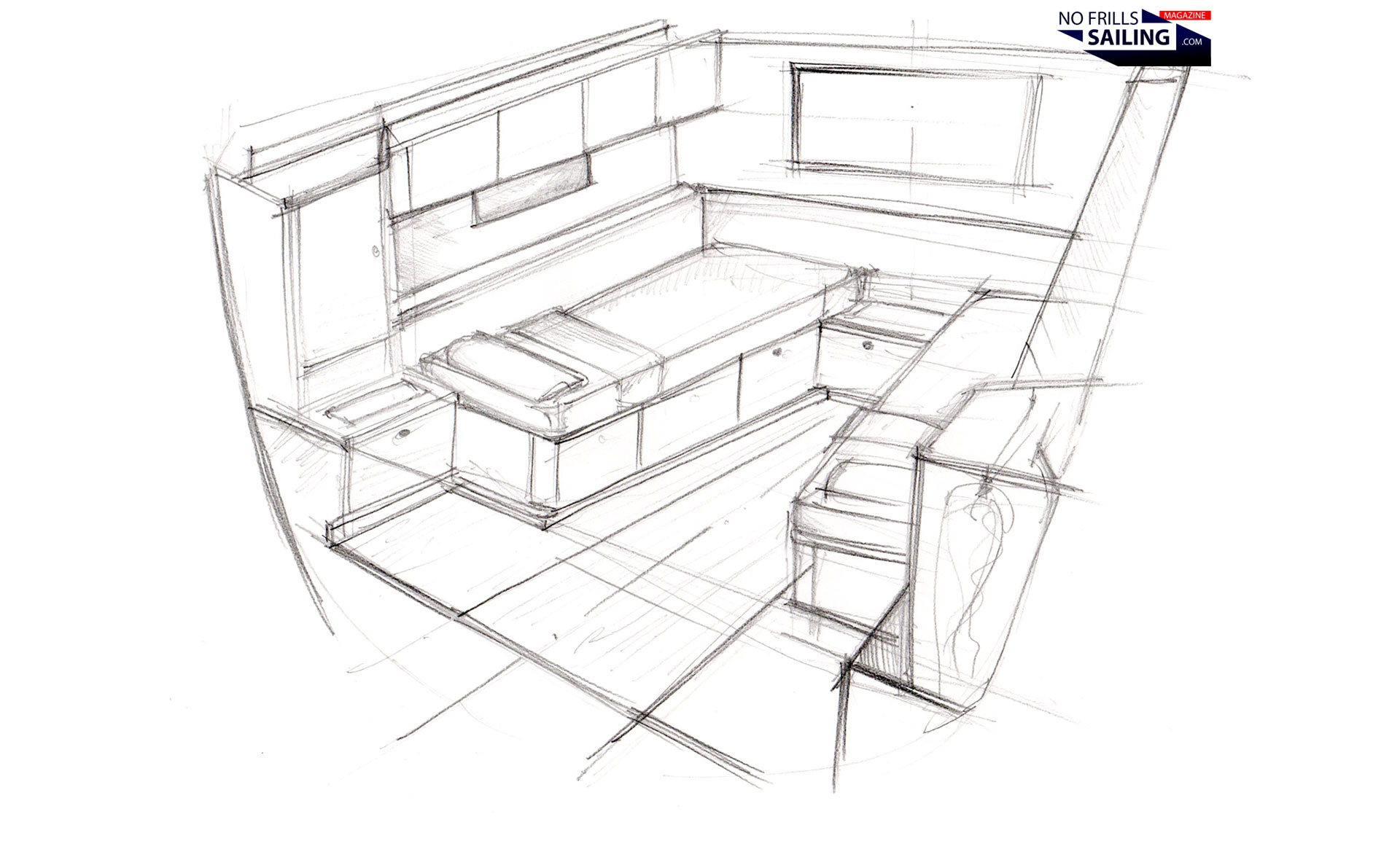Lars Reisberg | NO FRILLS SAILING.com: “What I´ve also noticed in your interior designs is the fact that it´s striking how “accurate” your interior design, the location of things and positioning of elements like the galley or seating area, absolutely matches the location of Umberto´s hull- and coachroof-windows and even bulleys: Did you work closely together (outside and inside) or do you just took Umberto´s lines and made the best out of it? It seems you did indeed work hand in hand.”