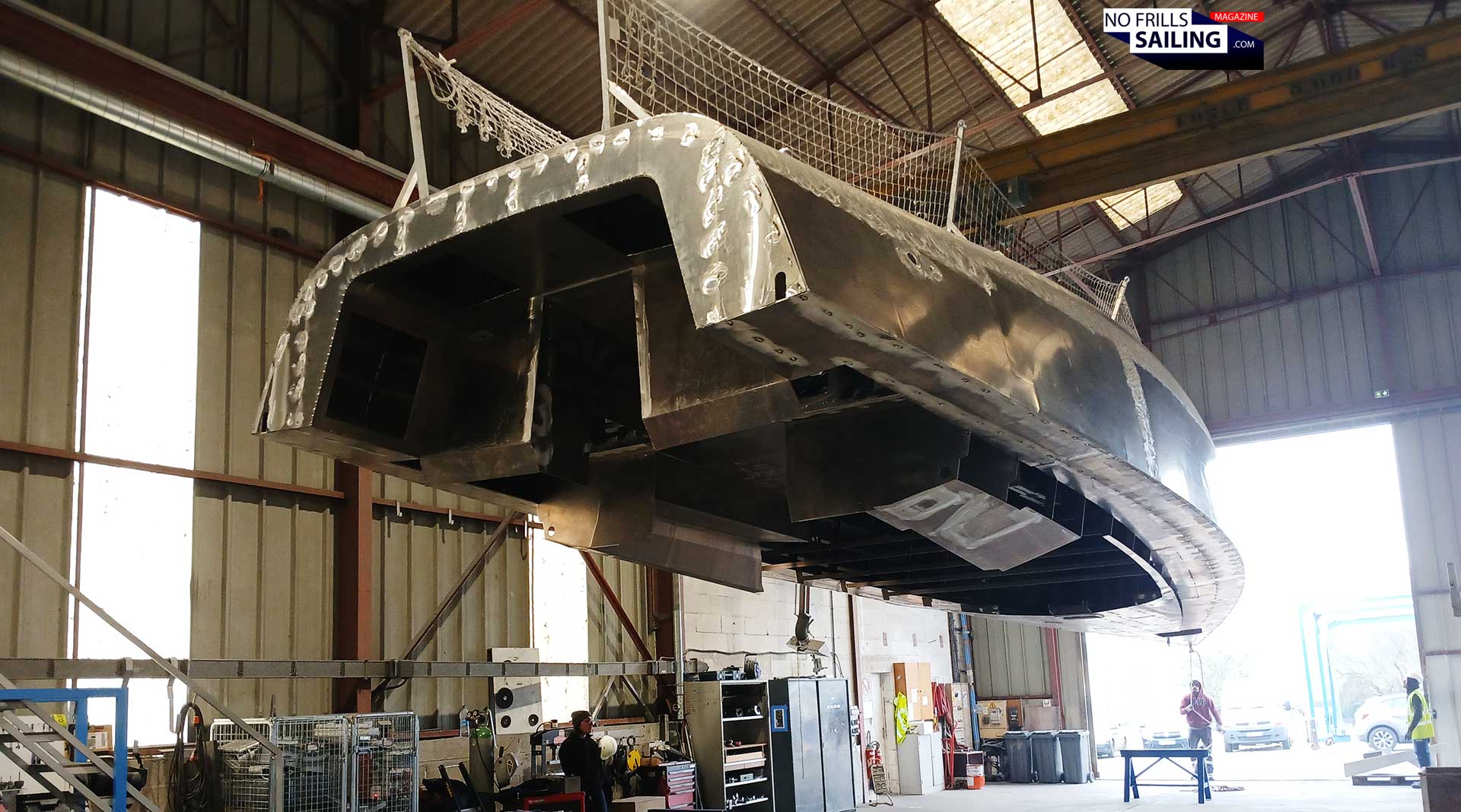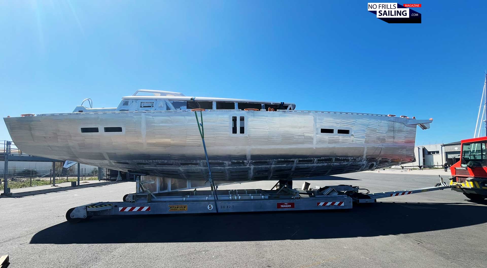 Antonio gives a bit more insight into the hull construction of their Grand Large aluminum yachts: “If you want to know exactly, I can say that in the bottom area, 10 millimeter thick plates are used, then 8 and 6 millimeters above that, and for the upper freeboard, where contacts are rather unlikely, we use 5 millimeters thick plates.” So there’s always at least half a centimeter of solid metal between you and the ocean: And that’s a whole lot of resistance! “As for the “primary skeleton” of the boats, the material thickness varies here too: After all, we also want the boats to remain as light as possible to still sail fast. For the reinforcements in the keel area, the bottom parts, frames, and deck beams, the aluminum beams are between 1 and 1.2 centimeters thick,” Antonio continues. And that, I think, sounds impressively strong!