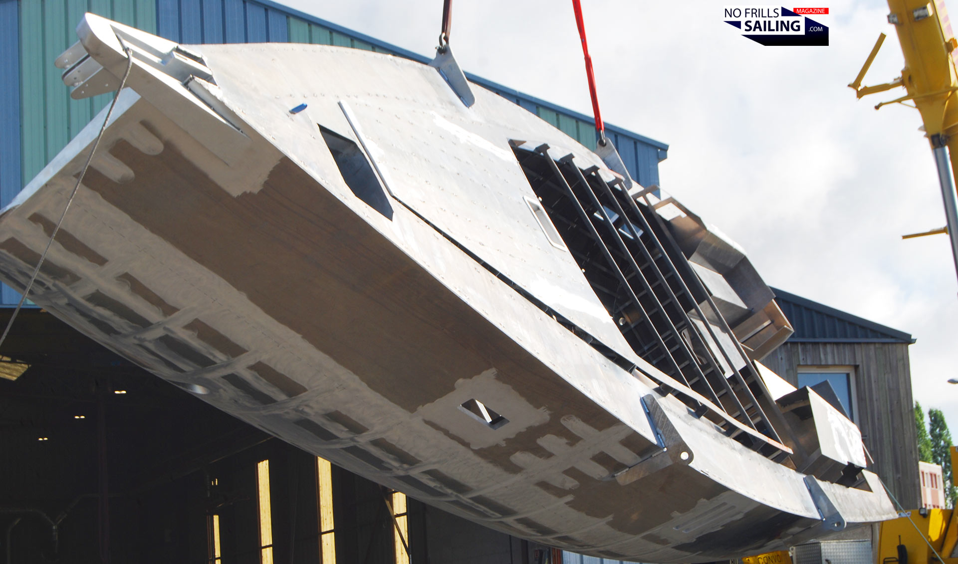 Some boatbuilders, like Alubat with their Ovni, make hard chined hulls. The hull is welded together by only five to eight large longitudinal panels. A particularly simple and time-saving method of producing a hull. Hence, it´s of course much more elaborate to work out a smooth round shaped hull. I ask Antonio about this: “It’s hard to give an exact number since I haven’t built a hard-chine hull myself. But it’s true that making chined hulls is generally considered less labor-intensive than our elaborate – and also very aesthetic – hulls.” To be clear: Hard chined hulls are not less safe, however, you may already see with your eyes that such a hull may behave a bit different hydrodynamically – hence in its sailing characteristics and speed – and may not be able to keep up with a smooth round hull. At least that’s what I think. So, yes, that may explain price differences from one aluminum-brand to another.