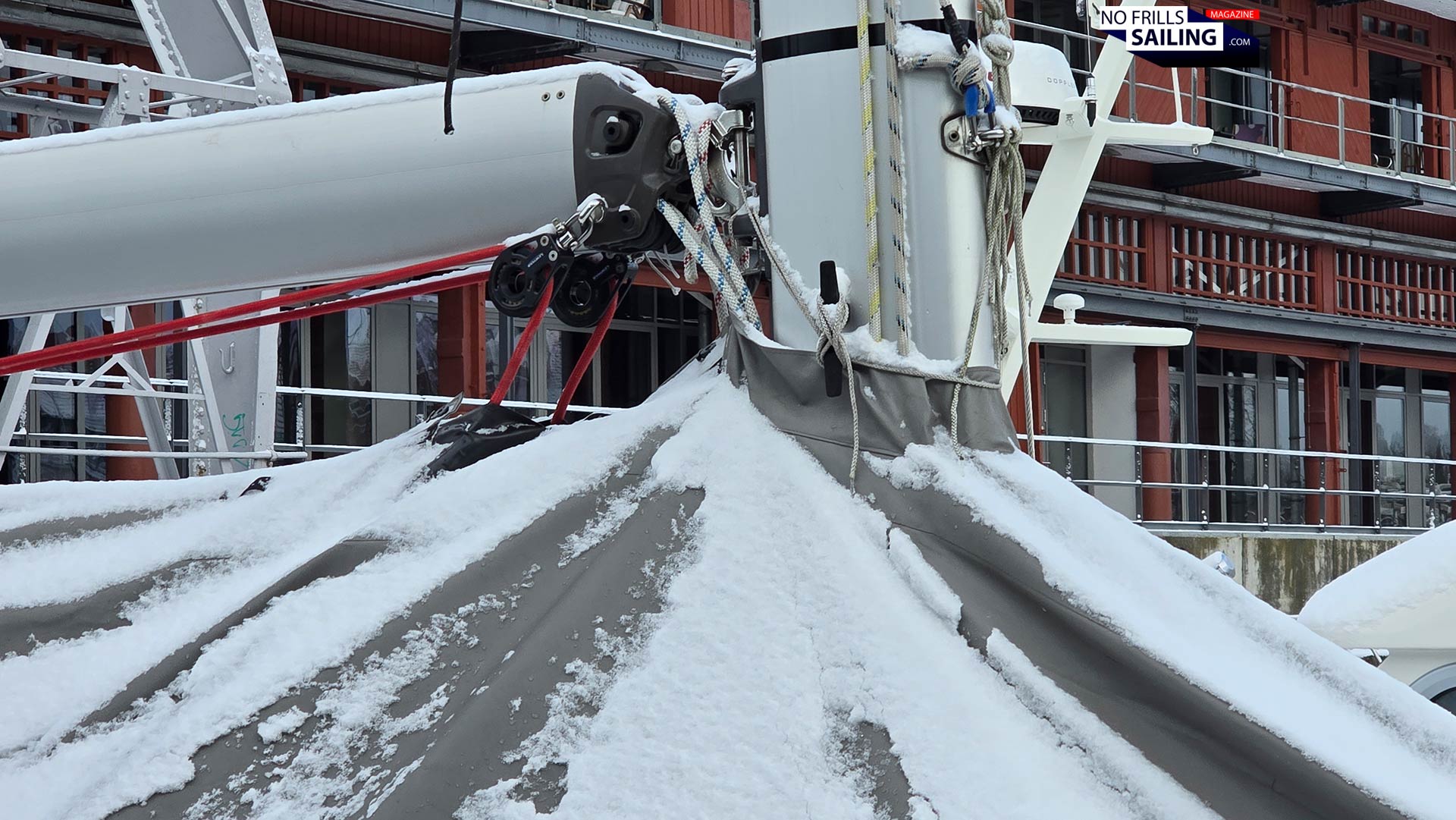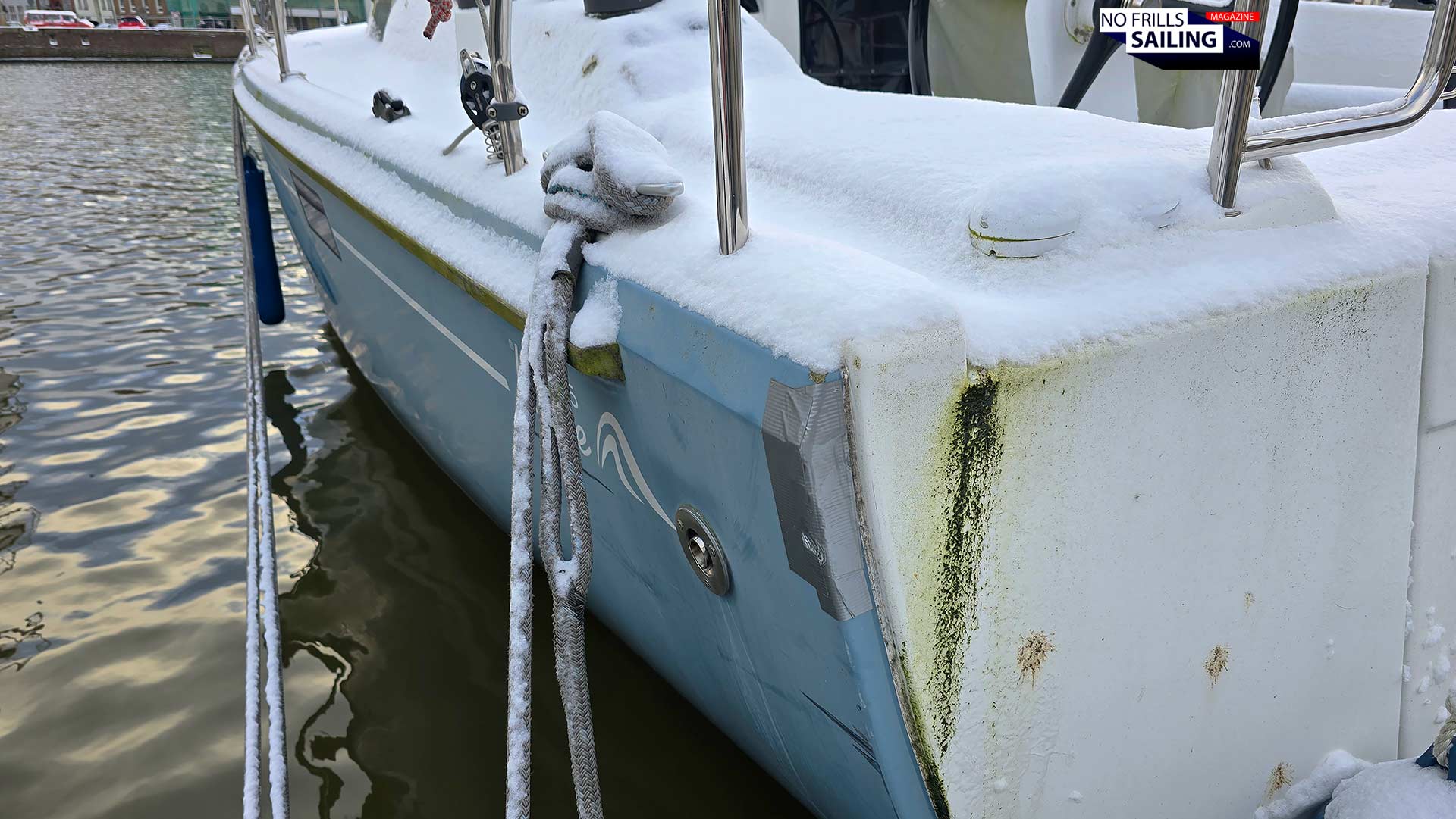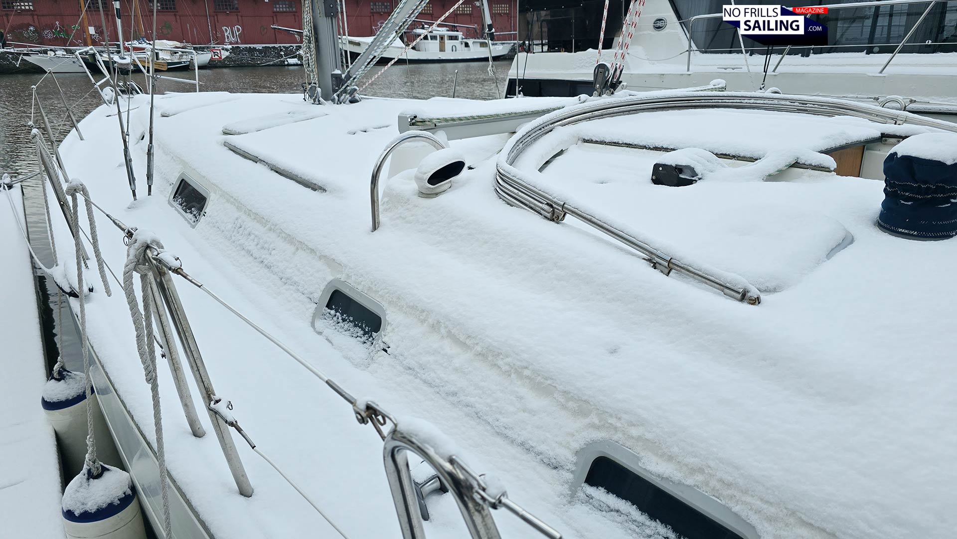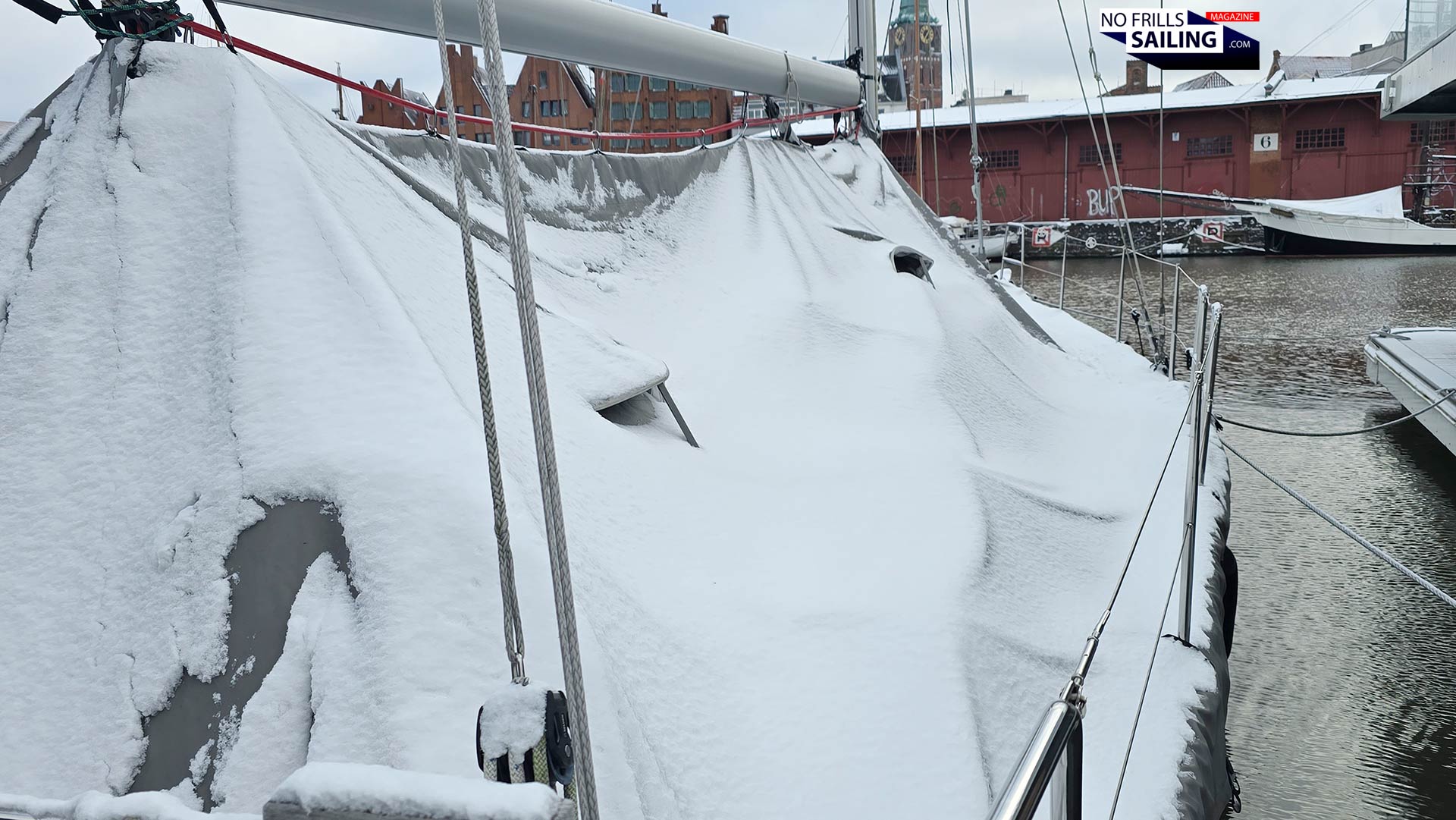 I know it´s maybe a bit too late to talk about the topic of winterizing your sailboat now that we are in the midst of the cold season. But apparently this one struck me just as I was on my daily walk today. I decided to deviate from my usual route around Luebeck´s old town and went into the city marina, called “The Newport”. A very nice spot with a breathtaking view on the marvelous old town. Why? Because after three days of unusually thick snowfall I wanted to roam through the untouched whiteness: Proper winter with snow are very seldom nowadays. And as I was walking past the surprisingly properly booked jetty, it became apparent that I should talk about winter tarps and sailboat storage in the water. So, here we go.