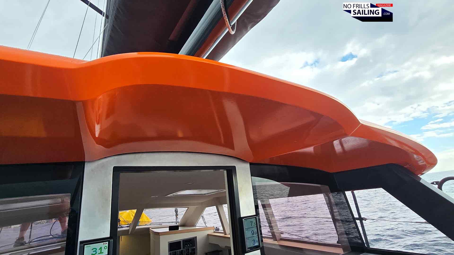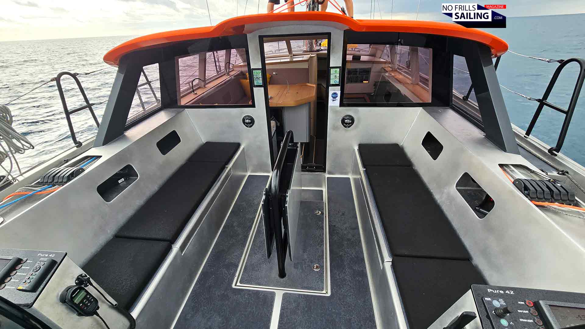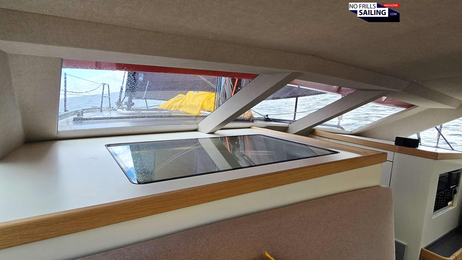 That said, these are the last exterior details I wanted to show you, which I forget to mention in the sailing article. I think it´s a cool “warm up” and appetizer to finally do what we came here to do – checking out the Pure 42 interiors. That said, entering the deck saloon is done through a big door. It´s a rigid Goiot glass-hatch that slides down, disappearing below the cockpit.