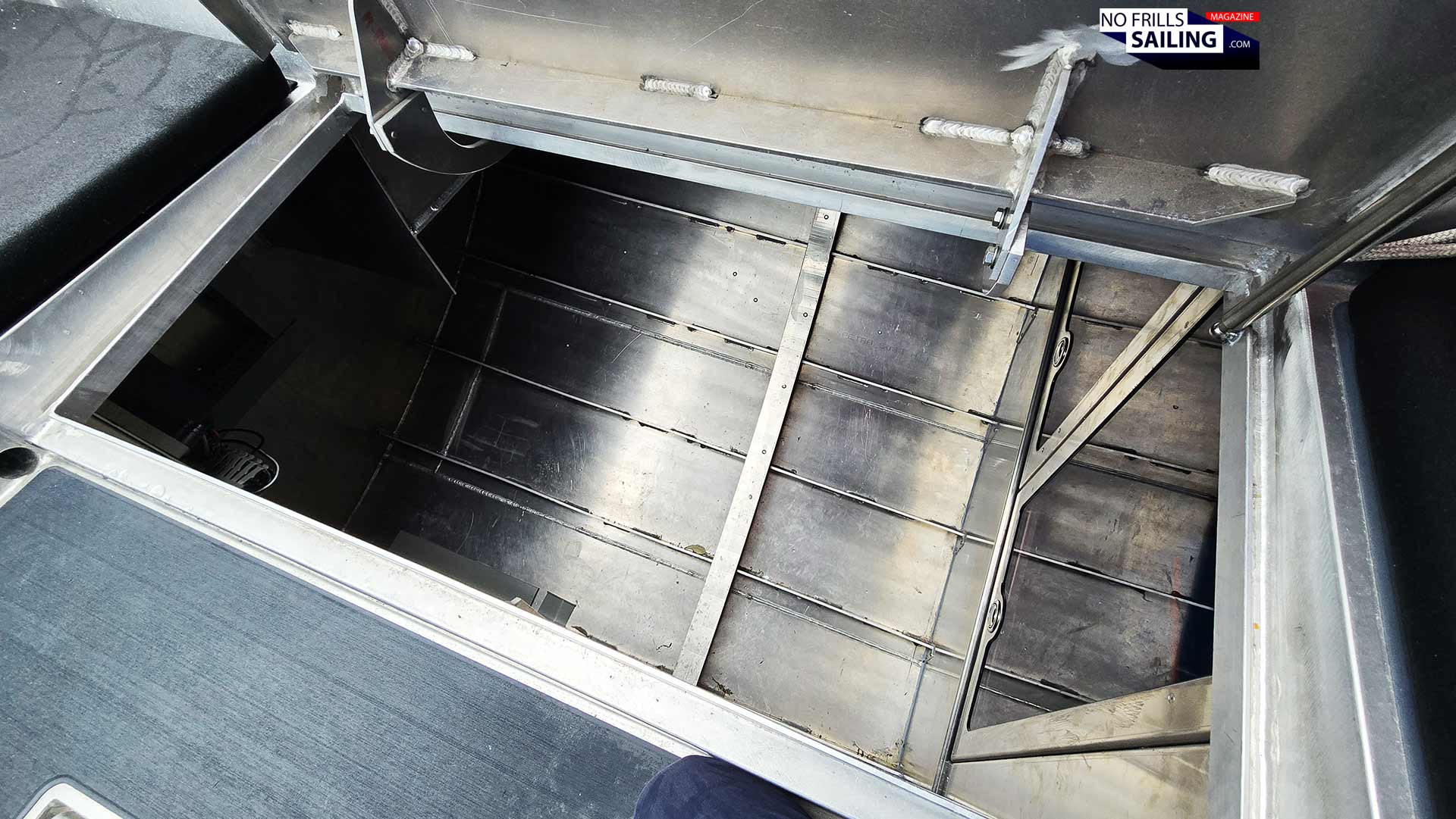 The biggest of which is entered by opening the extra-large cockpit locker lid of the portside bench. It reveals a nice look onto the aluminum construction of the rigid metal hull. Apart from the fact that this looks absolutely amazing and beautiful, it always instills such a confidence and trust in me – it´s the best material to build a boat with that should last “forever” and moreover, go anywhere, unimpressed by whatever mighty nature will throw at you.