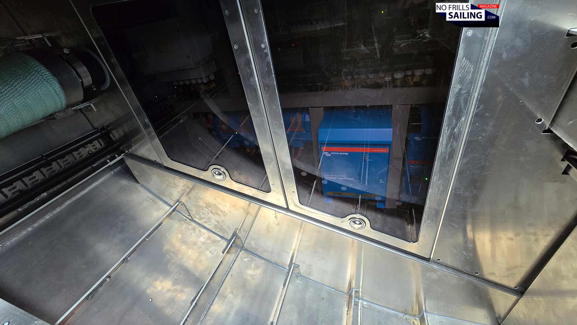 The locker-volume underneath is huge, considering the fact the back here no cabin is fitted. It´s a great access to the steering and autopilot-area right before the transom, adjoining the deck salon bulkhead, a watertight compartment with glass hatches (very beautiful!) can be seen where all the charging and converting electronics and other equipment, like circuit breakers and such, are cleanly and beautifully installed. Access for maintenance and repairs is exemplary, I really like this. Bonus: In here, all fenders and much more will fit just nicely.