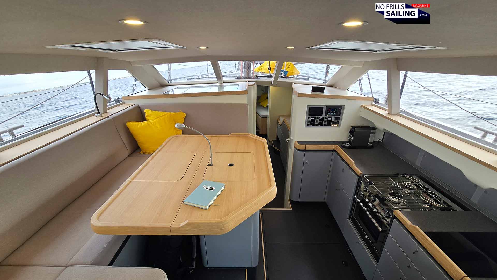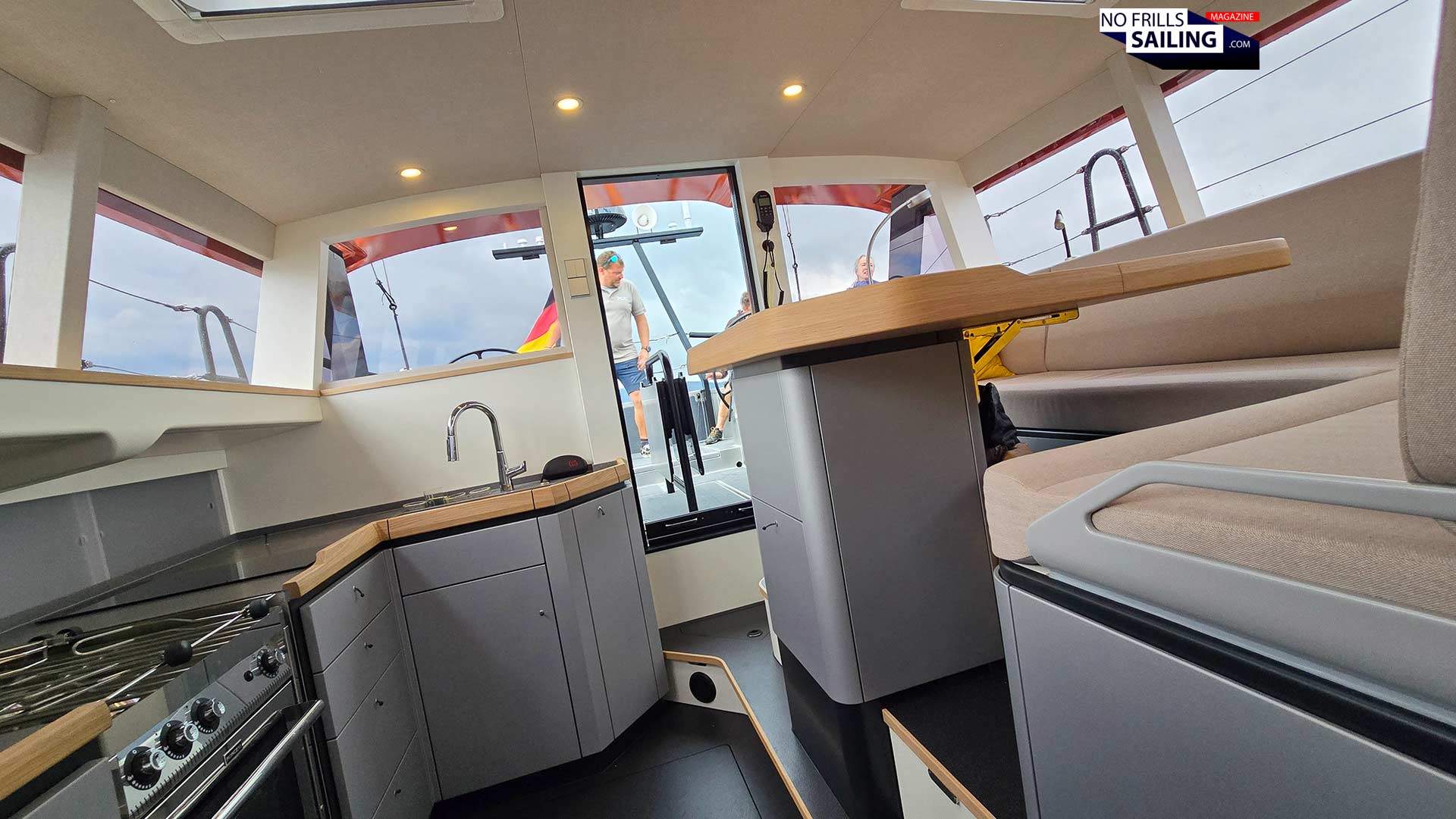 For TOM KYLE´s sister ships, starting with upcoming hull #002, the windows will be changed to full glass tapered windows, as this prototype utilizes acrylic window-material. Making your firsts steps inside, you can decide to either go up one step to sit down in the dinette or go down a step into the galley area, which then further leads to the front area where the cabins are located. Instead of just fitting a simple staircase, they went for a nicely designed angular shape, a bit “disguising” the steps. I like it!