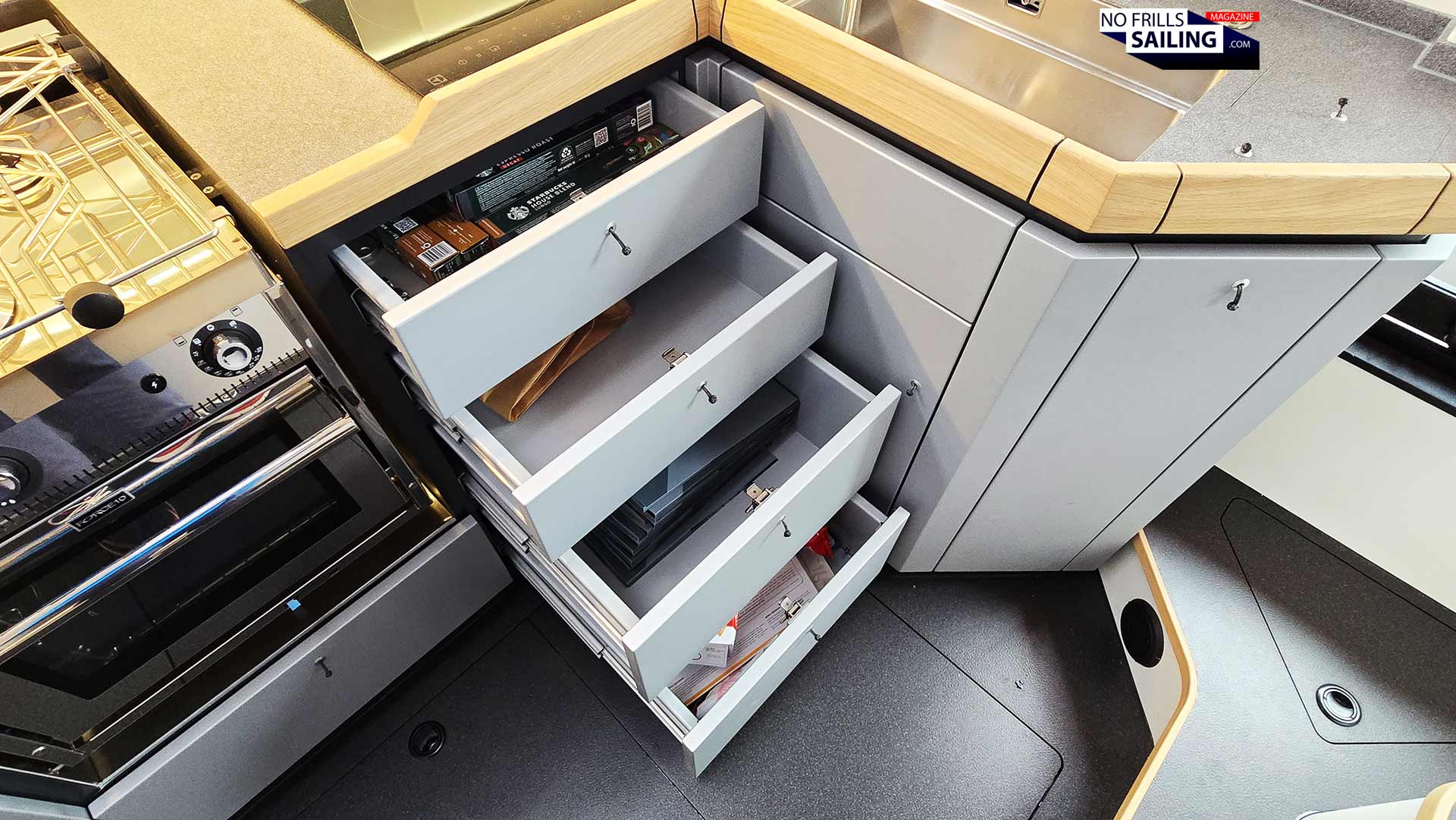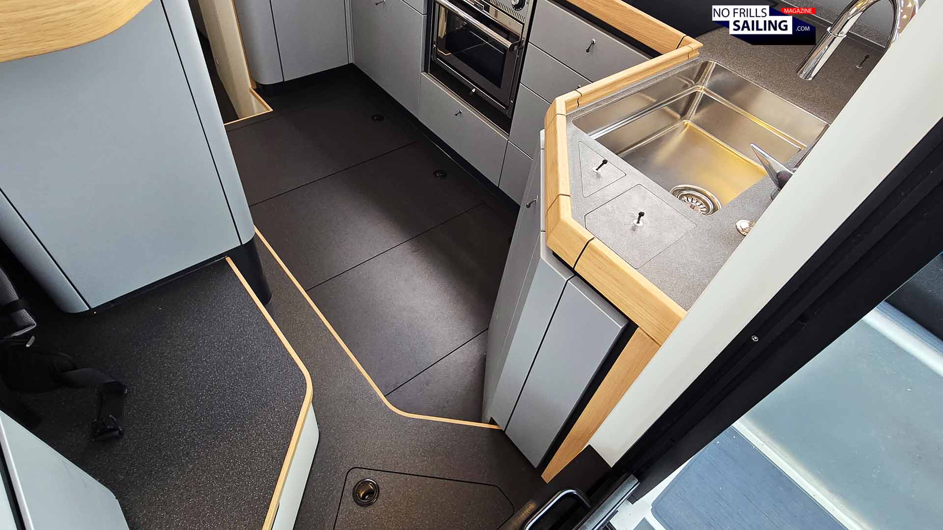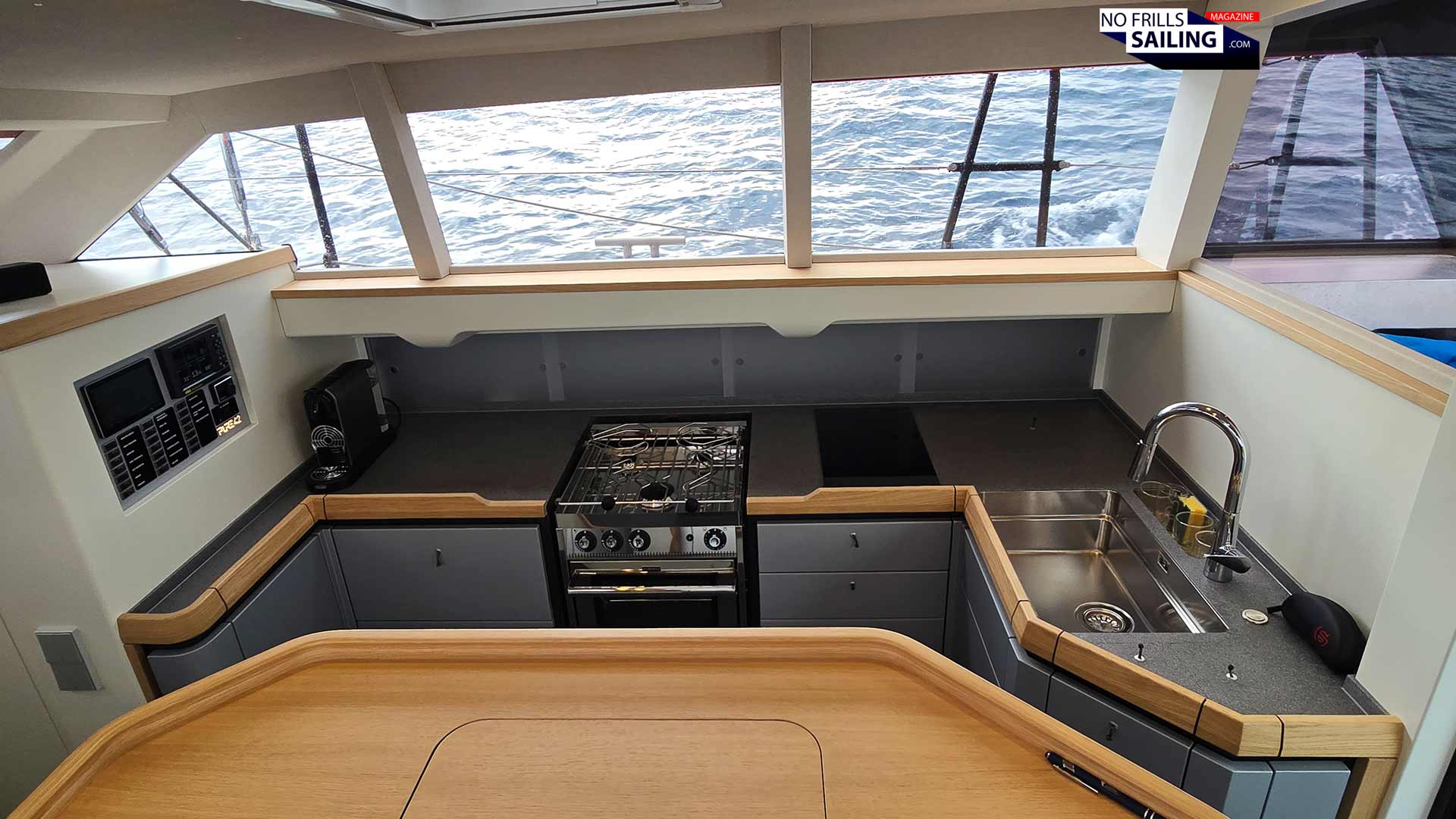Apart from the captain, the ship´s cook is the second most important crew member. And of course, when underway, decent nutrition and tasty food is a staple for an accomplished vacation and nice trip. Even more so if you think of the Pure 42 as a long haul boat that offers true live-aboard-qualities for a sailing couple. So, let´s look at the galley first.