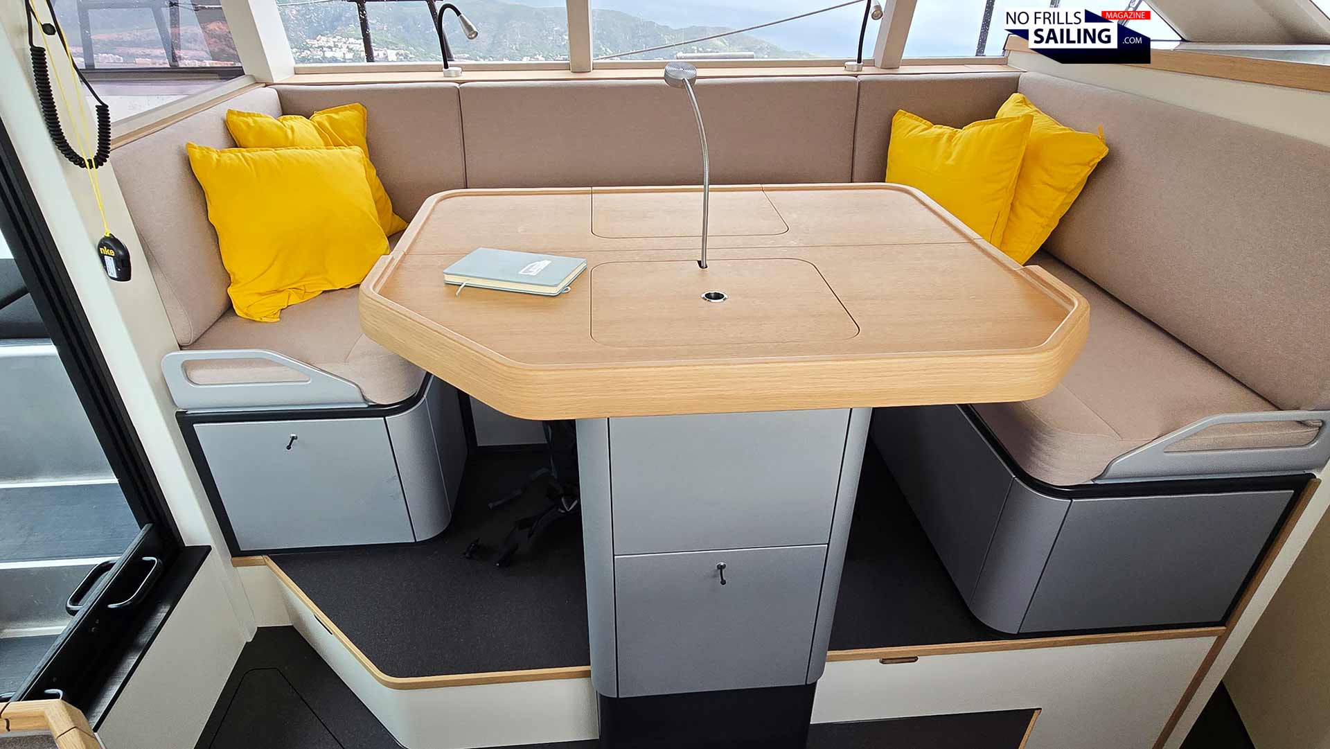 It gives the whole boat a modern look and offers a good balance between best possible freedom of movement in the boat in relation to most surface area of internal volume. That said, I take a seat behind the large main desk at the dinette. When the tabletop is folded down, an inlay that is stored behind the backrest can be used to transform the sofa into a berth. This way, on long night watches in empty sailing areas, you may stretch out for a few minutes or a second watchman can take a nap while being as nearest as possible to the helm.