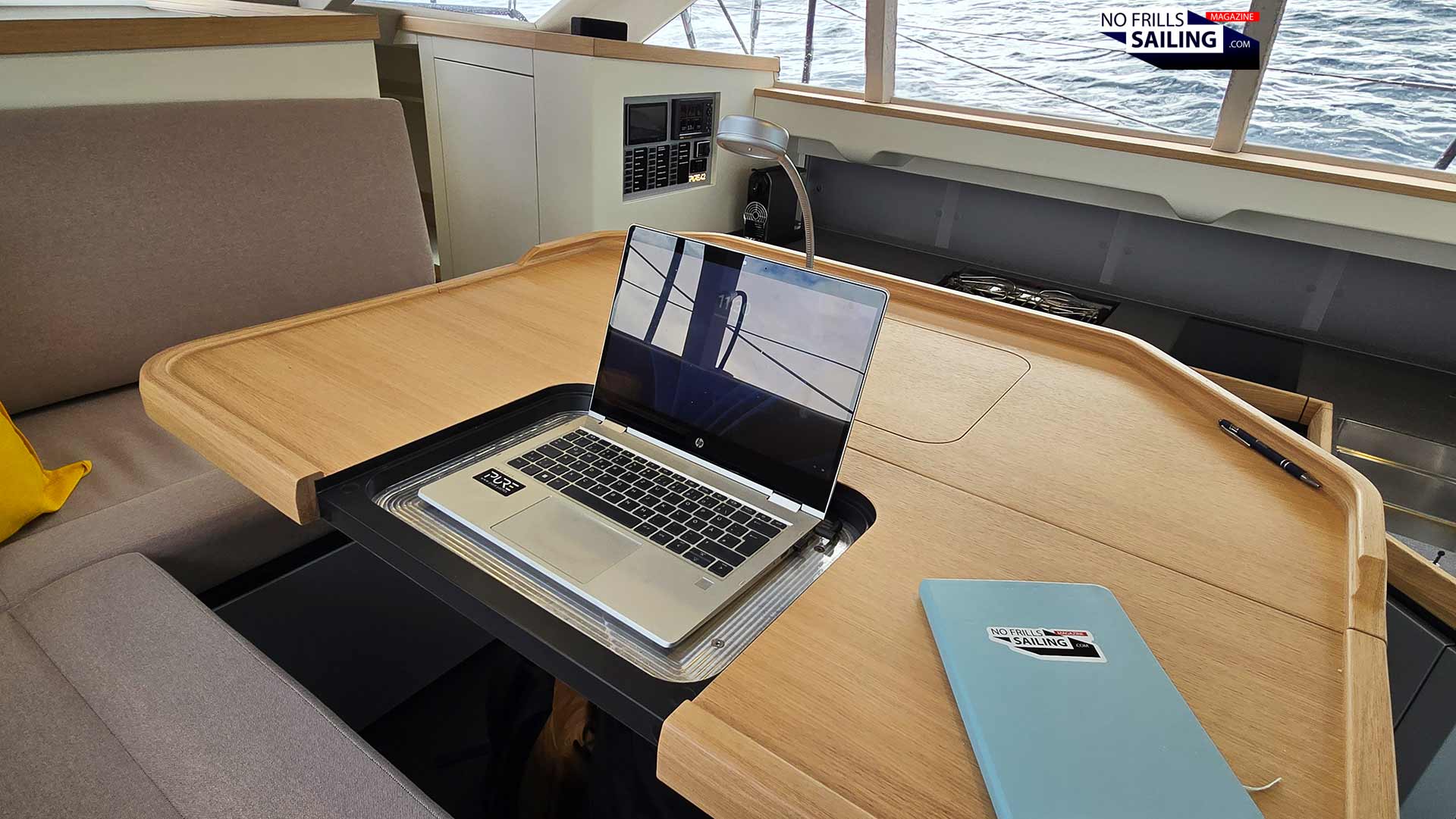 I like this little detail: A part of the table top is a cutout that can be taken off. Underneath an induction loading port if revealed, which is also a safe stand for your laptop. It´s custom made so you can adapt it to your personal computer (or just leave it out). In any case, this points towards a very important feature: Boat office and earning money while underway.