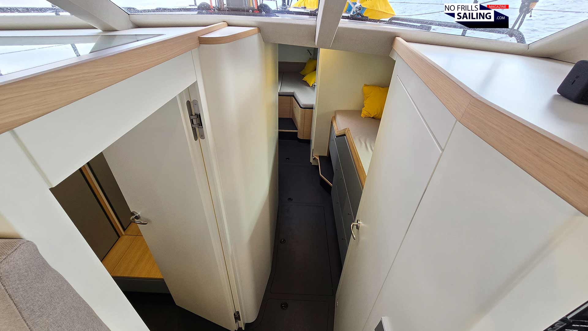 Standing at the fore end of the alleyway, two steps down this alleyway is prolonged. It´s slightly offset a bit to starboard side from the midship axis to bypass the central lifting keel-housing and creating more volume for the cabins on portside. Speaking of the lifting keel housing, its covered by a composite part and is very nicely integrated so that you barely notice it.