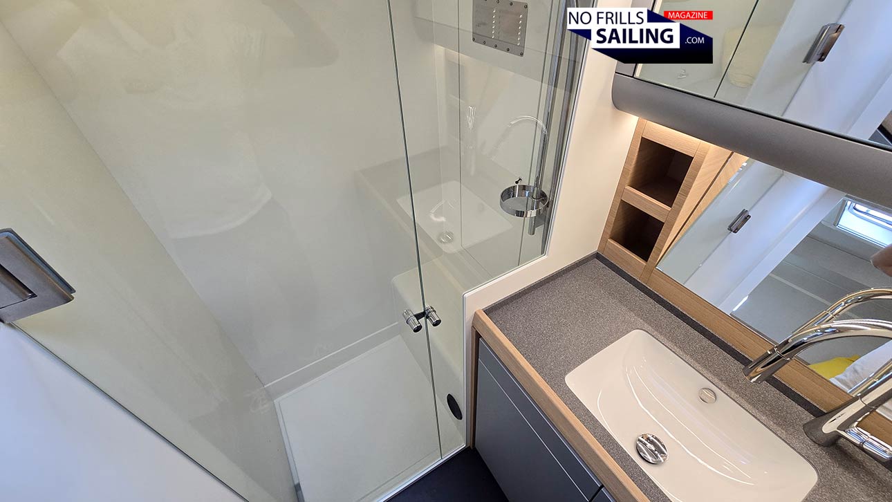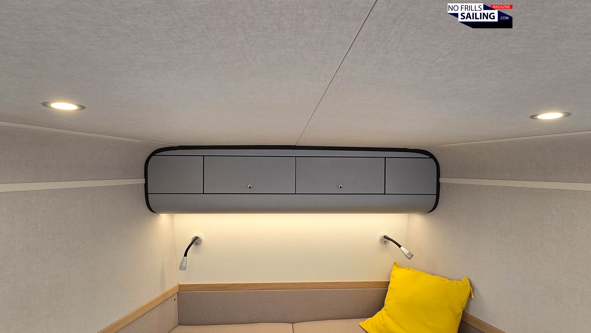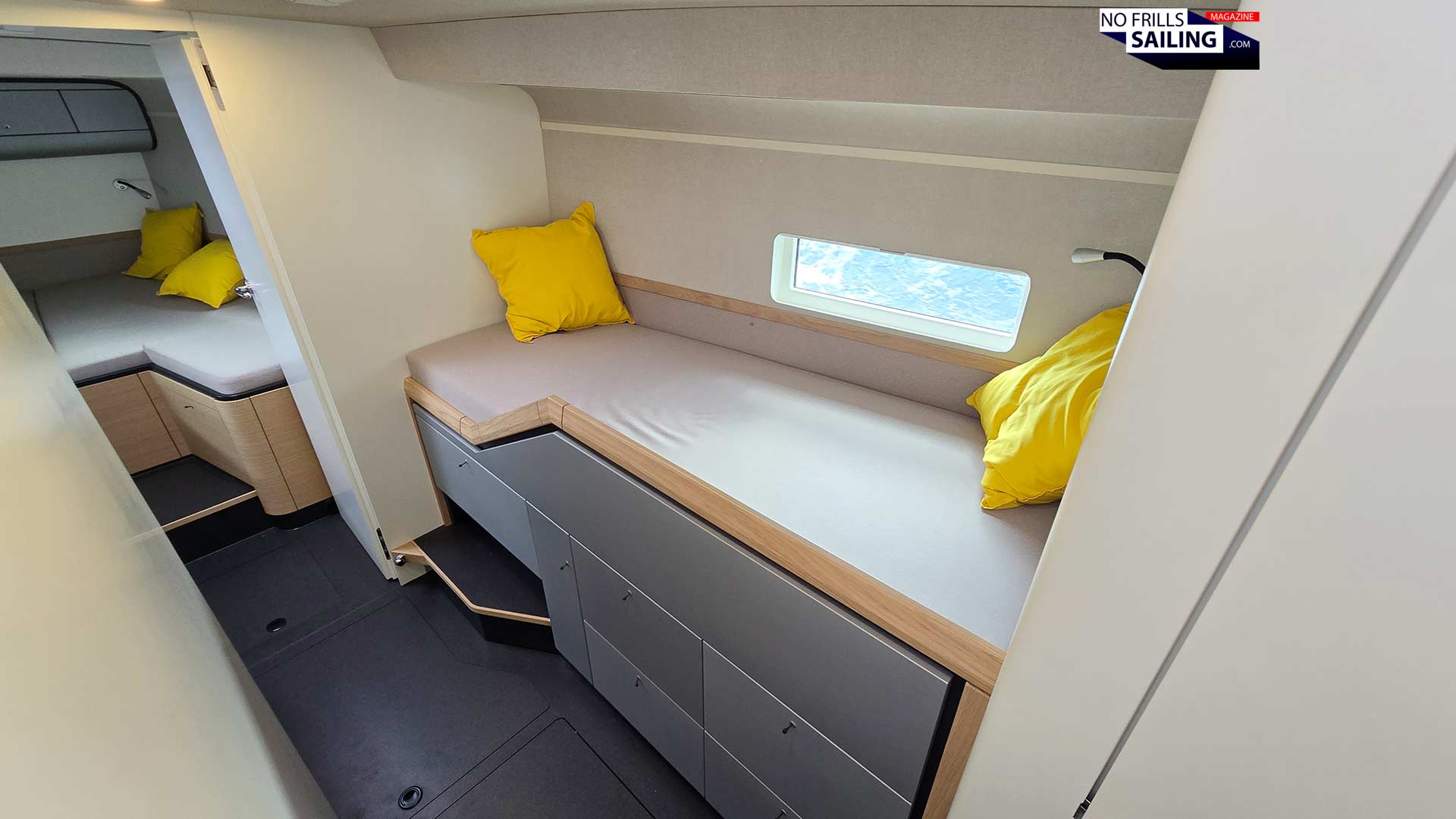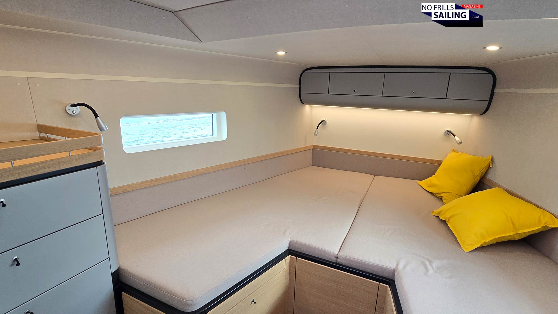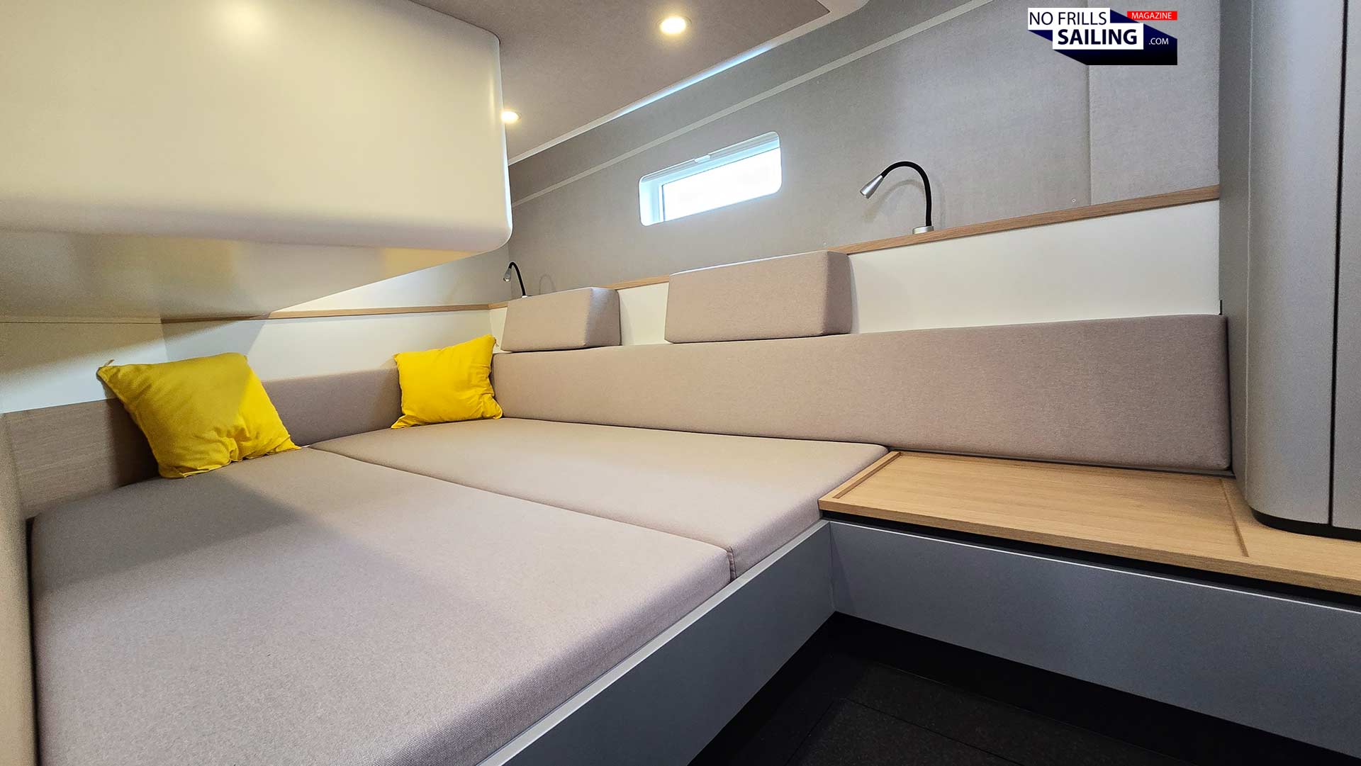 The cabin is blessed with lots of natural light which floods the room entering from the hull window and from above. Here, as you can see in the picture, a nice skylight lets in light coming through the front windows of the deck house. There´s a nice blind porthole installed as well that will let in fresh air from the side deck, cleverly draining possible water and preventing further ingress. This solution also creates an area in front of the bed where even tall people can stand upright get dressed/undressed unhindered and have a safe grab when the boat is moving more violently. Again, this is all very nicely integrated into the overall concept of the yacht – you barely notice sitting in the dinette from above what´s there underneath. Elegant!