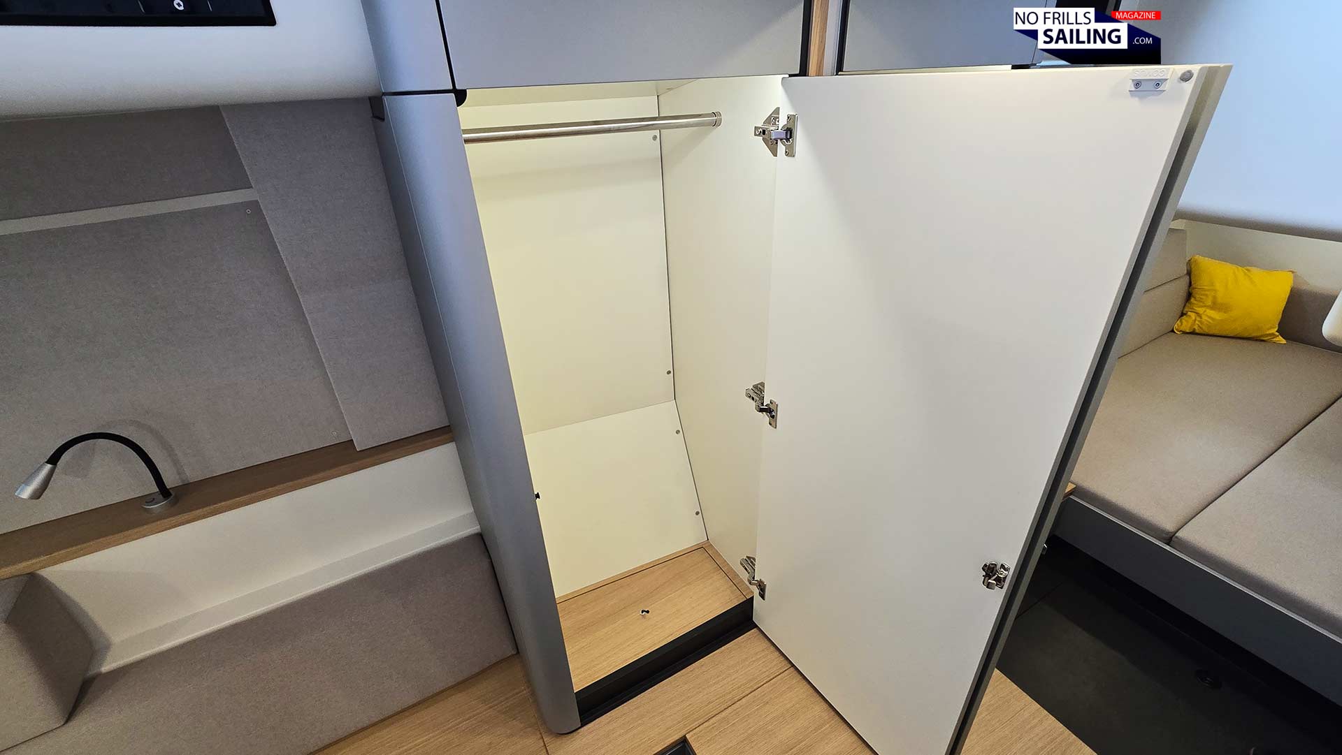 Back in the cabin, two little racks with trays go along the front side, framing a large hanging locker. Here you can place your clothing. With TOM KYLE, it is designed as a hanging locker only, I am sure you can have some trays and shelves if you want. This is the only stowage provided in this cabin and at first glance it appears to be a bit scant, but remember, this is not a charter boat, so owners can and will put their stuff all around in the boat. There´s no need to fill up the nice volume in the cabins with storage-cubicles.