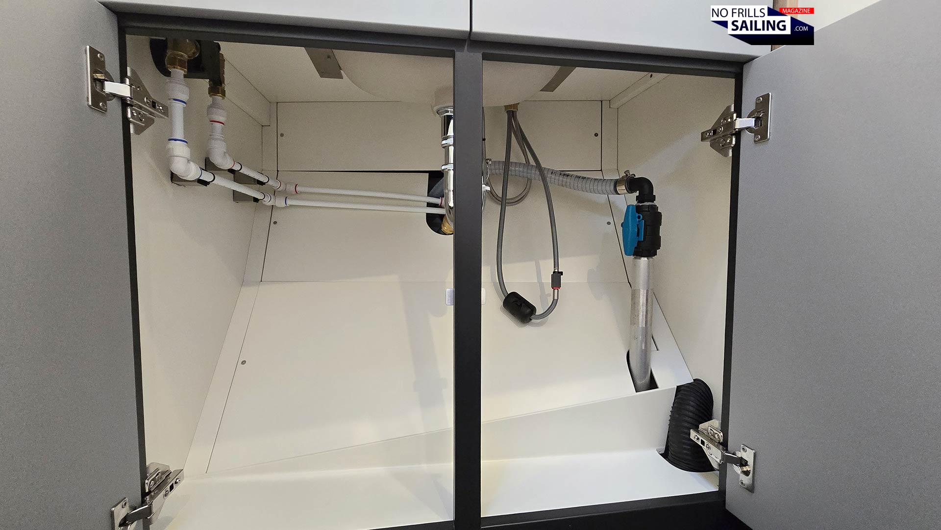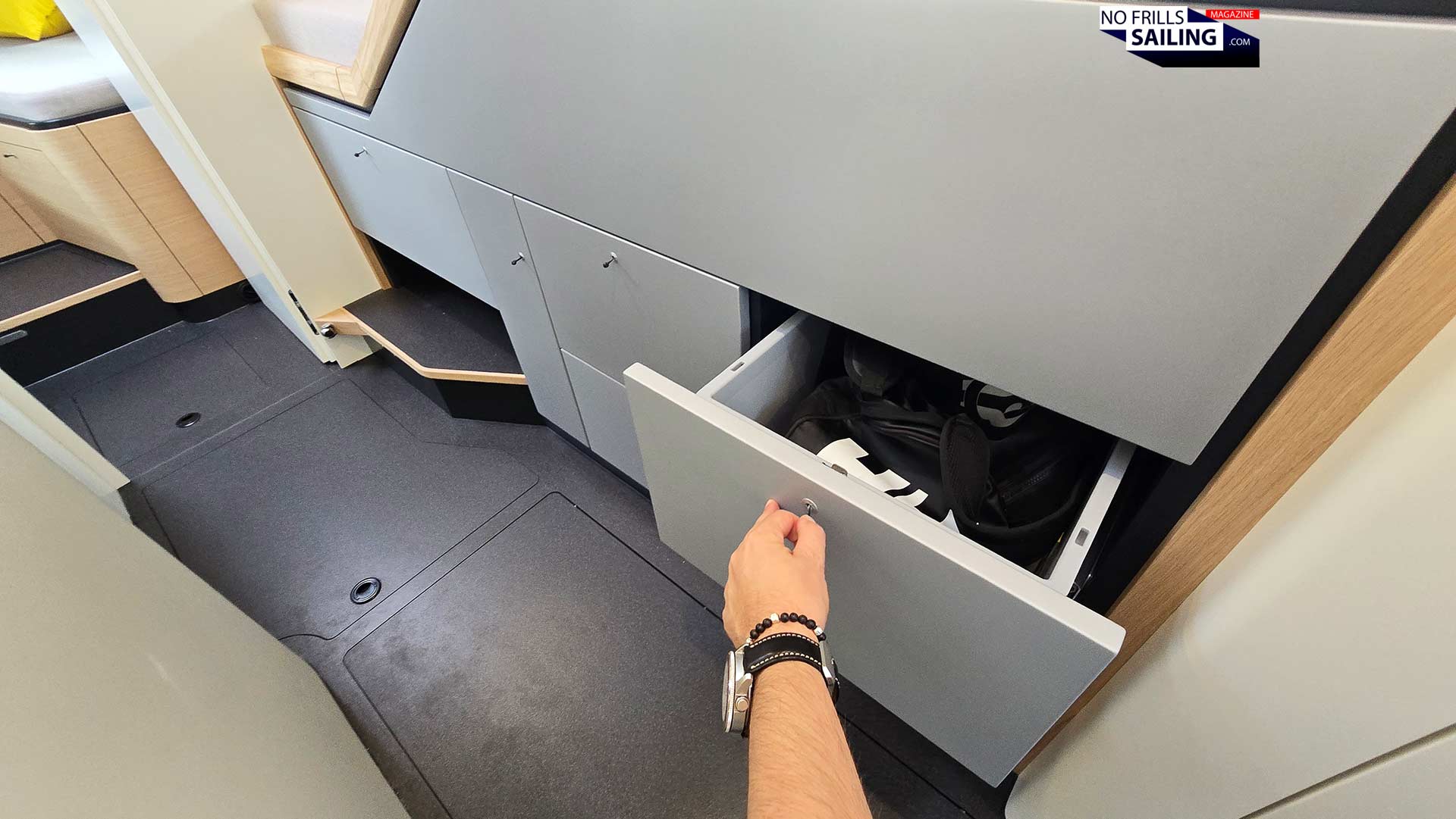 Talking about stowage, a common misconception when looking at these type of yachts is the notion of aft cabins. Neither the Pure 42 nor her bigger sisters do have those. All cabins are located forward of the cockpit, behind the deck salon and underneath the cockpit deck there´s just the engine compartment (of which I am shocked forgot to take a picture, but will deliver later) and … stowage. That´s a huge pro because this way everything that is potentially stinking, oily, blackwatery or fuming is kept out of the living compartment of the yacht. The boat has a collision bulkhead in the front, everything is well insulated so that down here the Diesel engine is just but a faint humming.