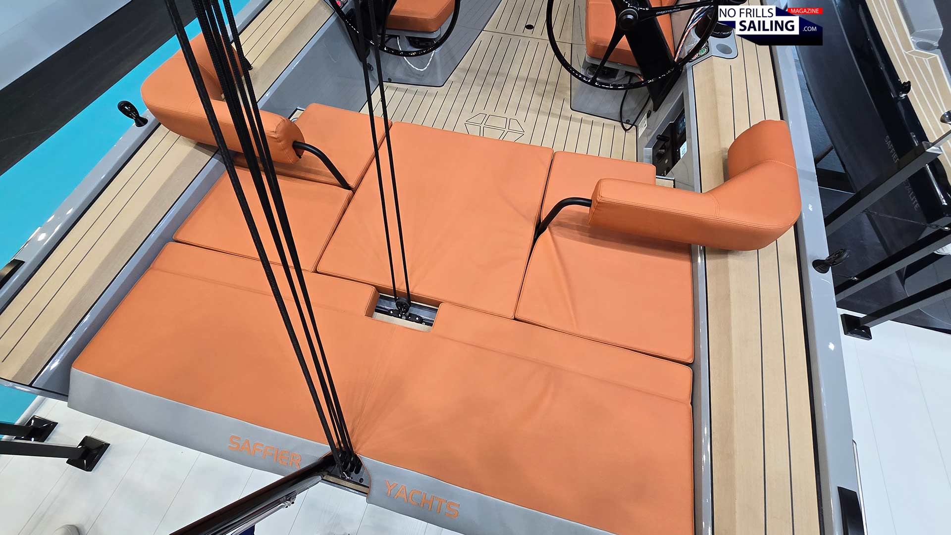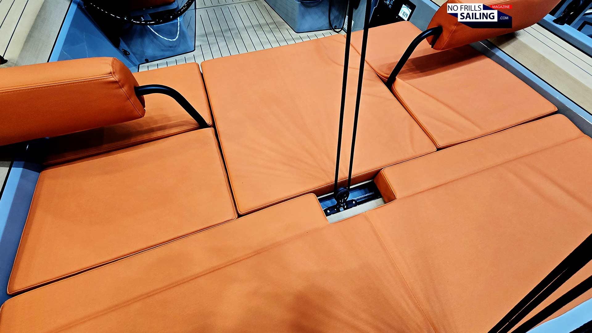 I particularly like how the main lounge area, which covers the whole stern section, covers not only the mainsheet but also the mainsheet track for the traveler. Even when sailing you might just fold back the little part of the cushion that covers the track, this way sailing and mainsail trimming is possible without even bothering your sunbathing guests. Simple, elegant and nicely set up.