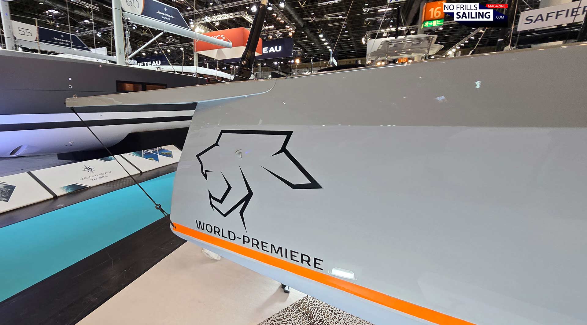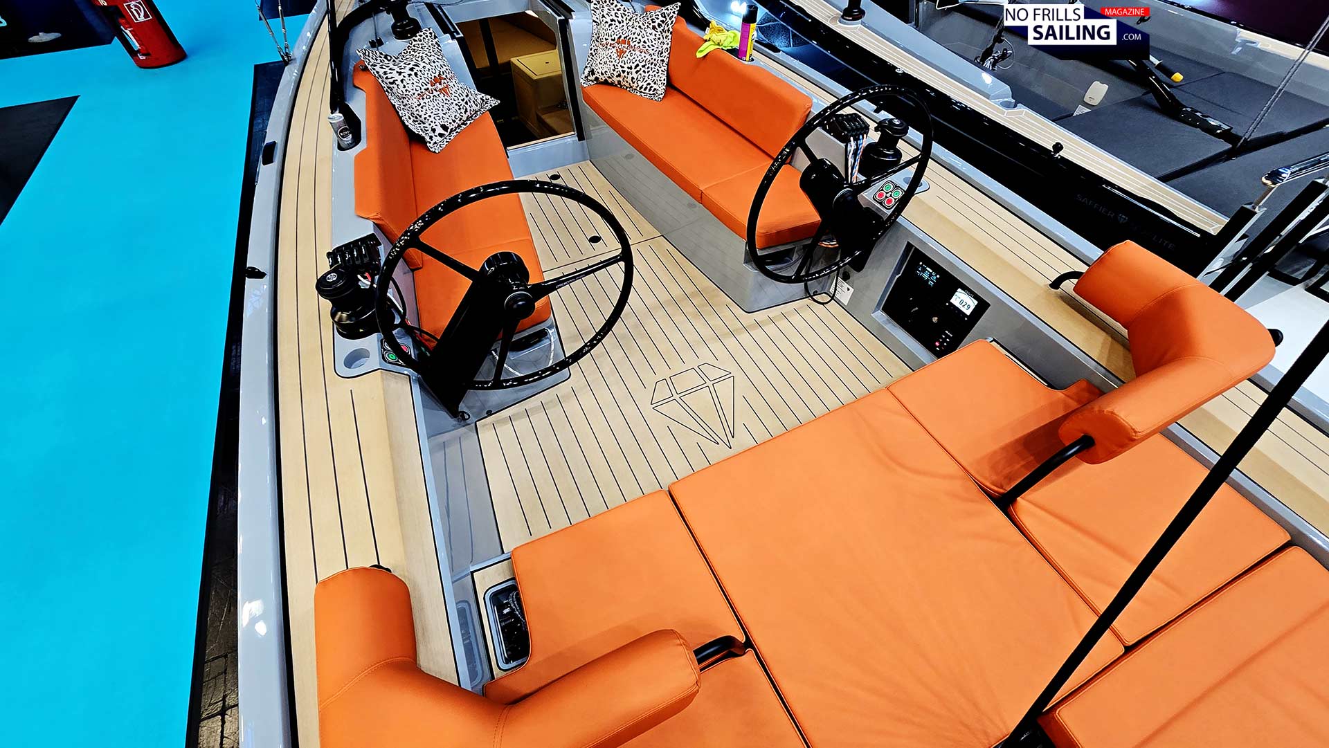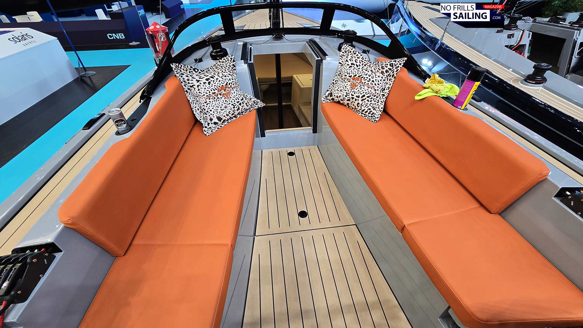 The most striking feature of this new Saffier design-wise is the bow section. Taking the idea of aggressiveness much further than her predecessors, the 28 Leopard comes with a very prominent negative stem which is even more pronounced in its boldness by the elongated bow sprit. I don´t know why they chose the name “Leopard”, but the decorative sticker on the exhibited boat may explain it: This boat should be taken seriously.