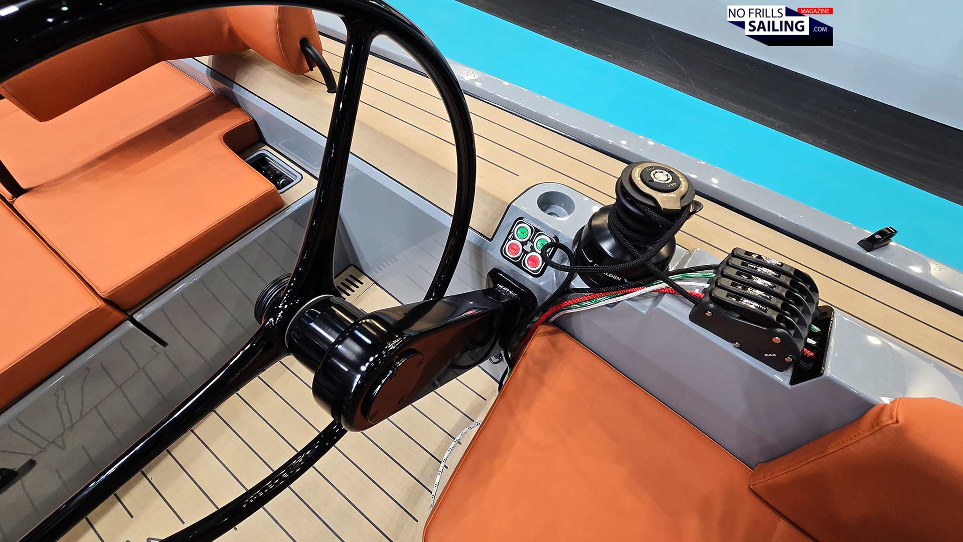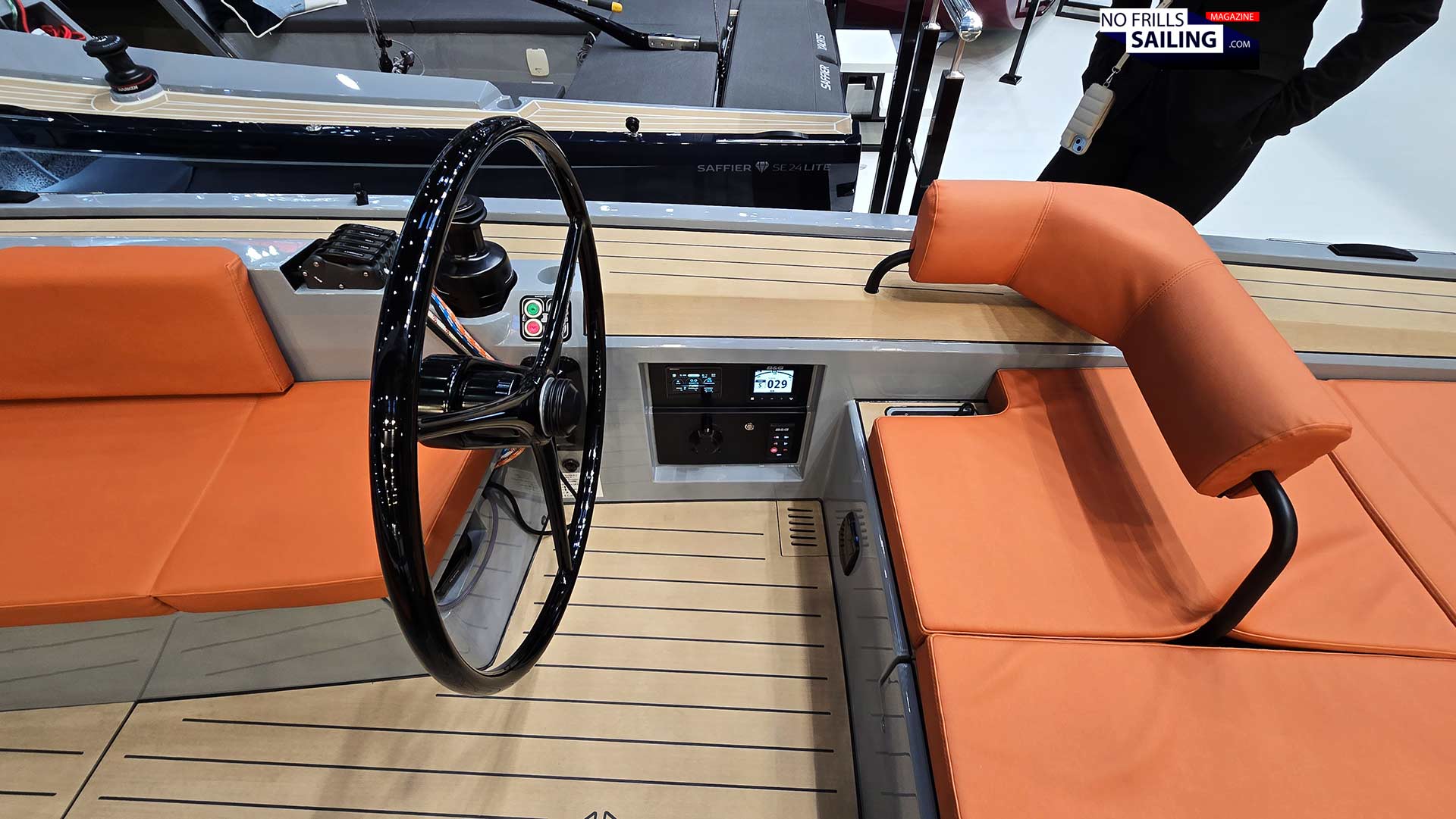 Looking more closely to the skipper´s workplace, I take a seat myself and test if I can reach for the wheel and the lines. Which is indeed very well thought through. The Saffier 28 Leopard is too small to sail her whilst standing upright, so everything must be reachable sitting down or on your knees. And it works out very well. There are some displays, but no chart plotter, wich otherwise would be a bit over-specced for a mostly inshore-used boat. On the other hand, wireless systems such as the Orca work very well on small boats like this, if you need a naval chart or other information.