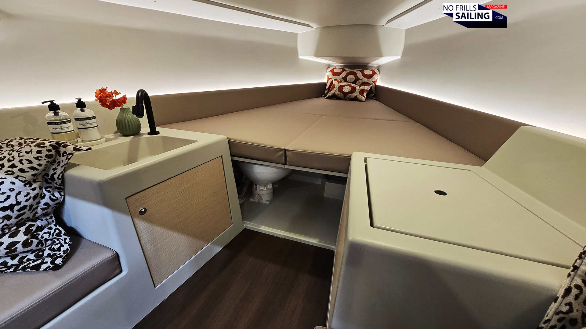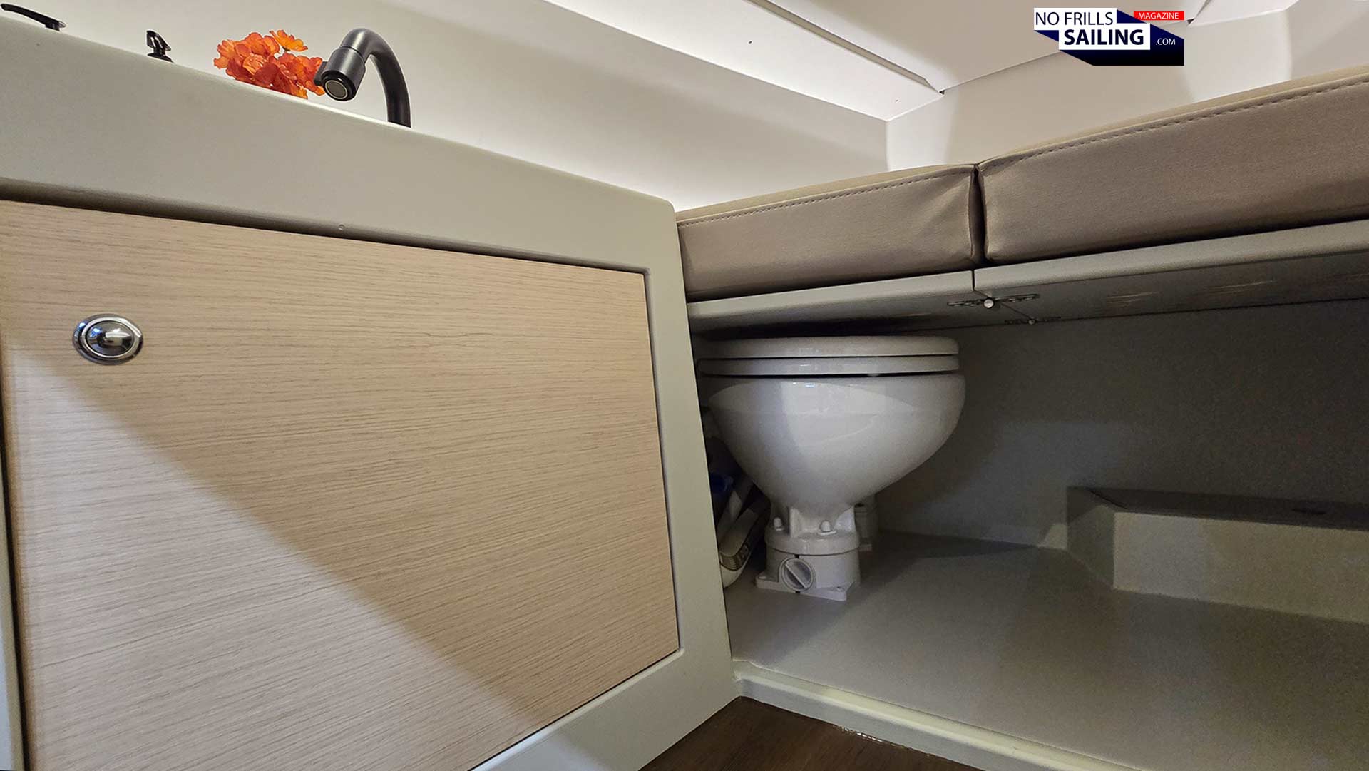 Okay, I may overreact now, but this is an absolute no-go for me. The pumping WC is located underneath the portside part of the V-berth. By folding up the mattress and wooden plank, you may take a seat and have a pee or a dump. We all know how important hygiene and especially relieving oneself is on sailing boats – even more when we are sailing with our partners, much more if guests and non-sailors are in board. In this, I explicitly welcome the shipyard´s option to integrate a toilet. But honestly, I´d never ever accept a free-standing WC in the middle of an otherwise completely open room!