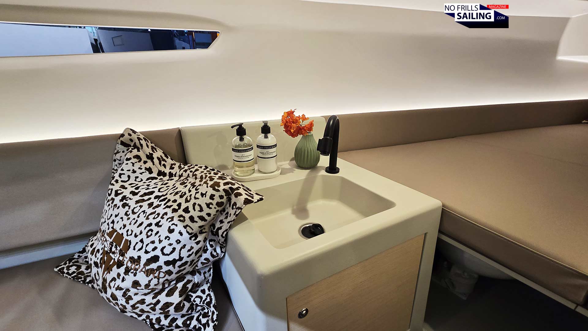 The fact that the boats comes with a little handwash-basin for hygiene (with a dedicated slide-out cabinet for a Nespresso coffee machine underneath!) does not make it better. I mean, there would have been more than enough space to integrate a little dedicated bathroom near the entryway down. I am not asking for much here. Sunbeam does it very well in their new 29.1, for example. A boat that is even smaller than the Saffier!